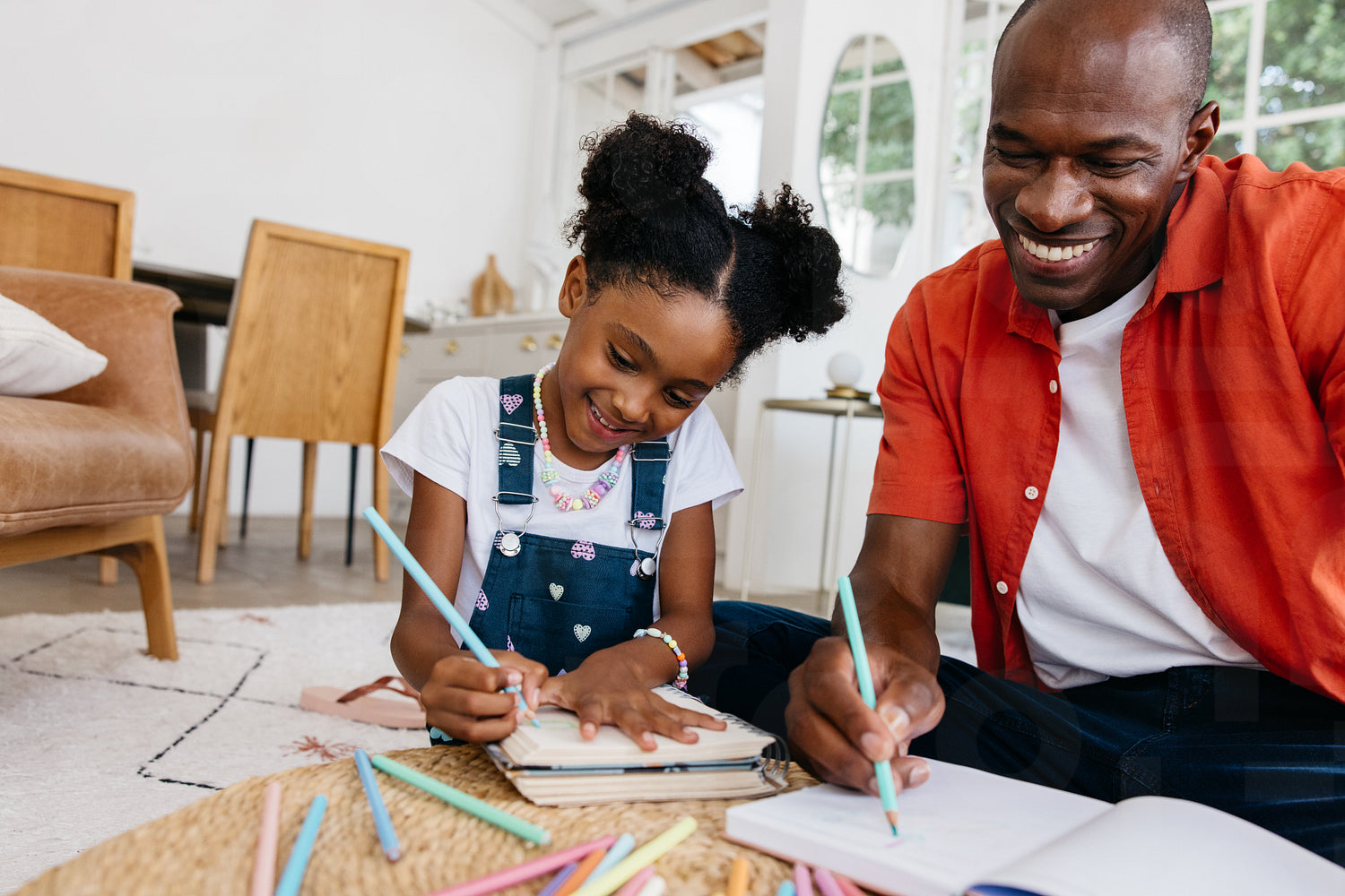 A young daughter and loving father smile while drawing with colorful pencils in their living room.