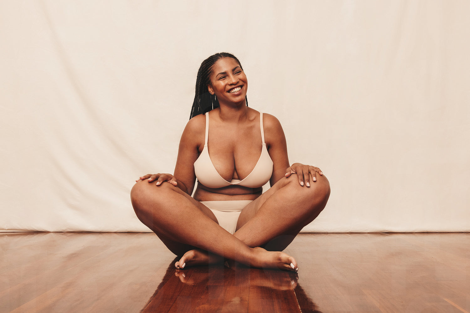 Body positivity and happiness. Young woman smiling cheerfully while sitting with her legs crossed in a studio. Confident young woman embracing her natural body while wearing beige underwear.