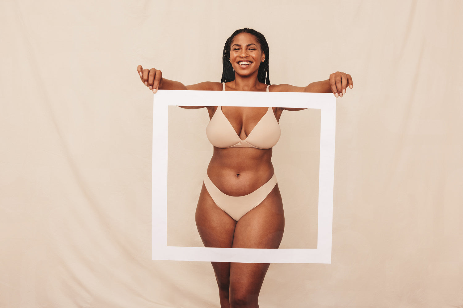 Capture this part. Happy young woman smiling cheerfully while holding a picture frame in front of her body in a studio. Confident young woman embracing her natural body while wearing beige underwear.
