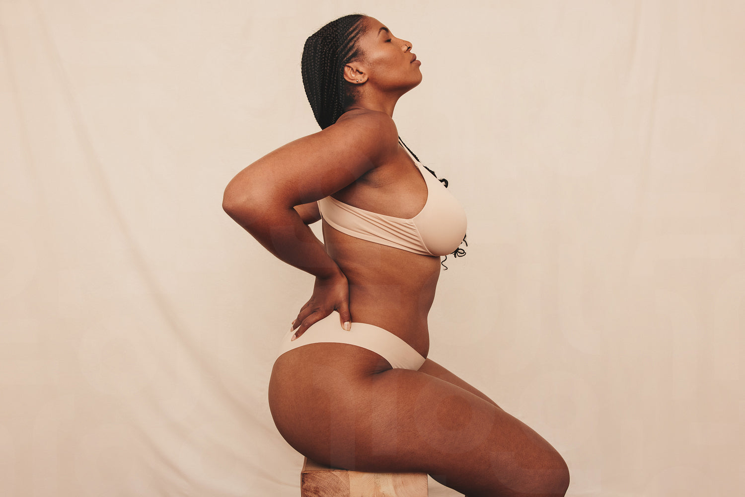 Embracing natural beauty. Body positive young woman sitting on a chair while wearing underwear in a studio. Confident young woman feeling comfortable in her own body and curves.