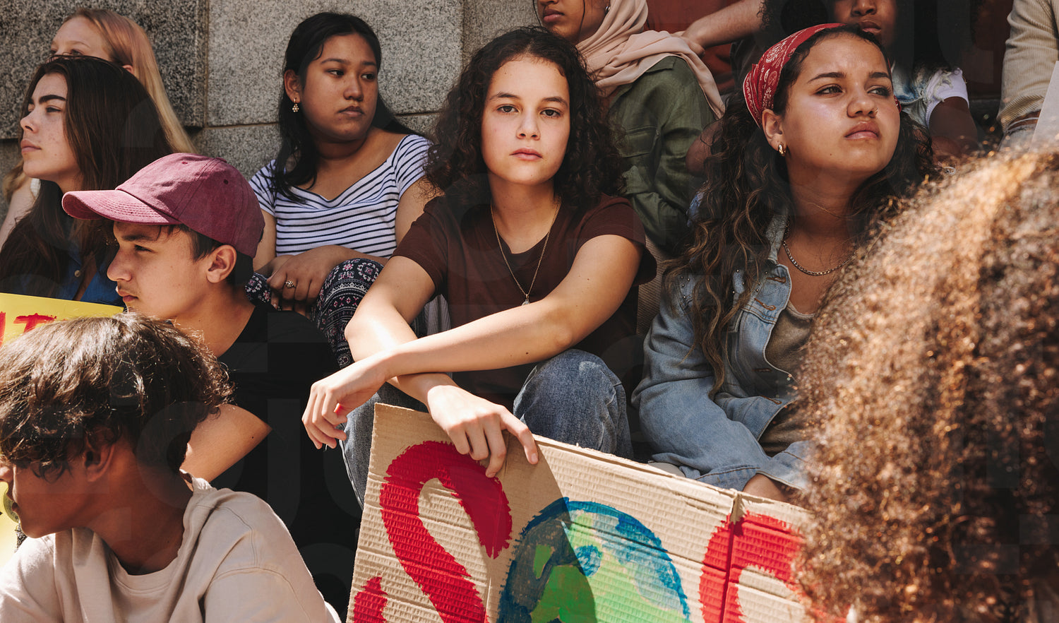 Diverse youth activists sitting outside a building with a "save our species" banner. Group of multicultural young people protesting against global warming and climate change.