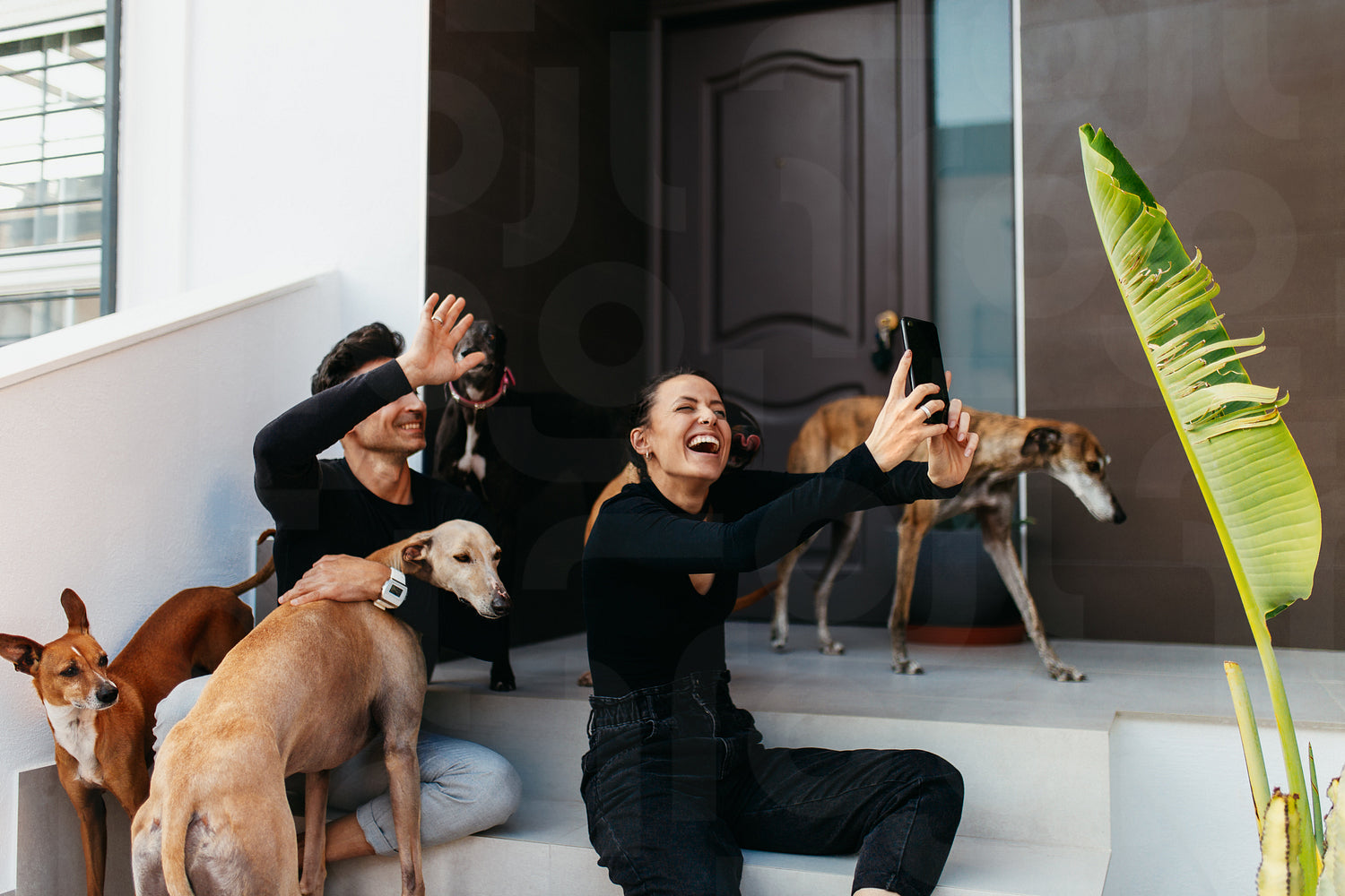 Two cheerful pet owners making a video call while sitting with all their dogs on the porch. Happy young couple showing off their family of dogs. Couple spending quality time with their pets.