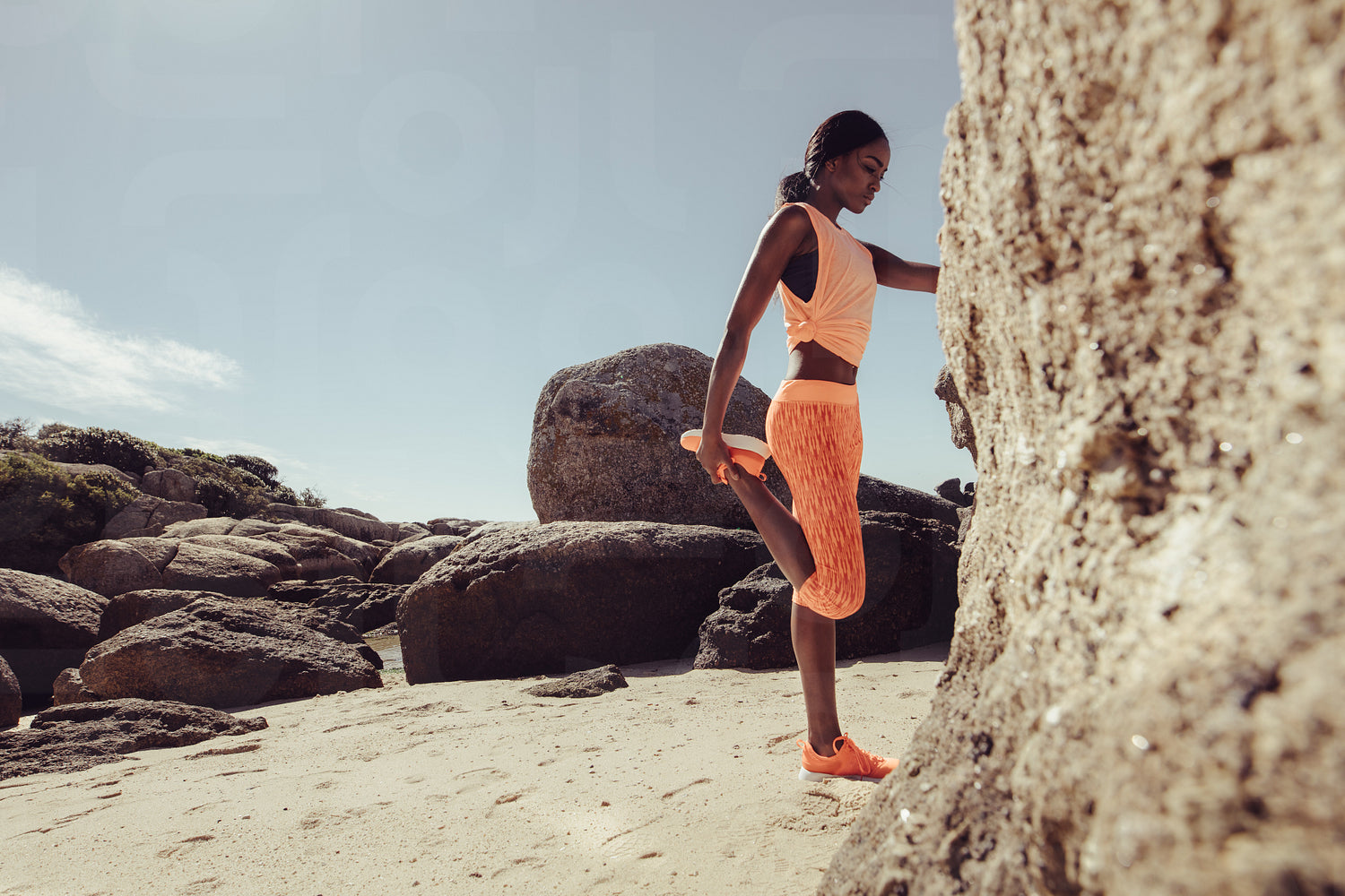 African woman stretching her legs, exercising at the beach before a run. Fit female runner stretching her leg at the beach.