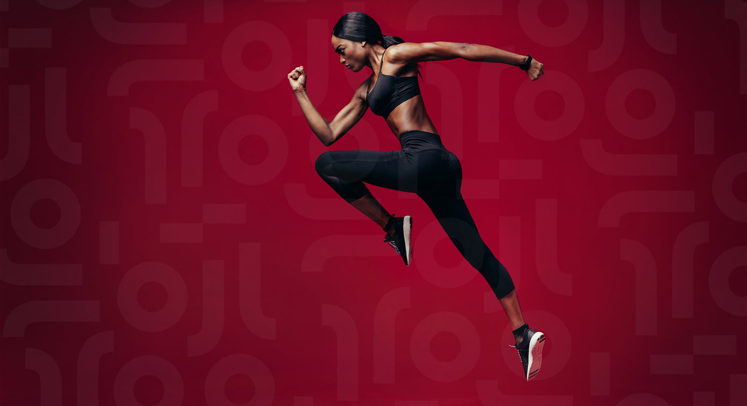 Sports woman running over red background. Full length shot of healthy young african woman sprinting.
