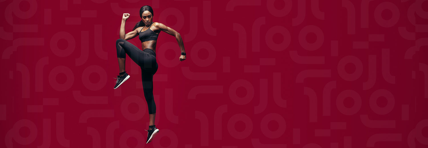 Sporty woman doing jumping and stretching exercise over red background. Wide shot of a healthy african fitness woman working out in studio. Lots of copyspace.