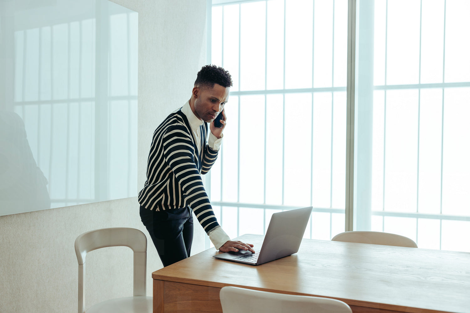 A focused executive multitasking in a modern office environment, balancing responsibilities with a smartphone and laptop. The scene highlights effective use of technology for productivity enhancement.