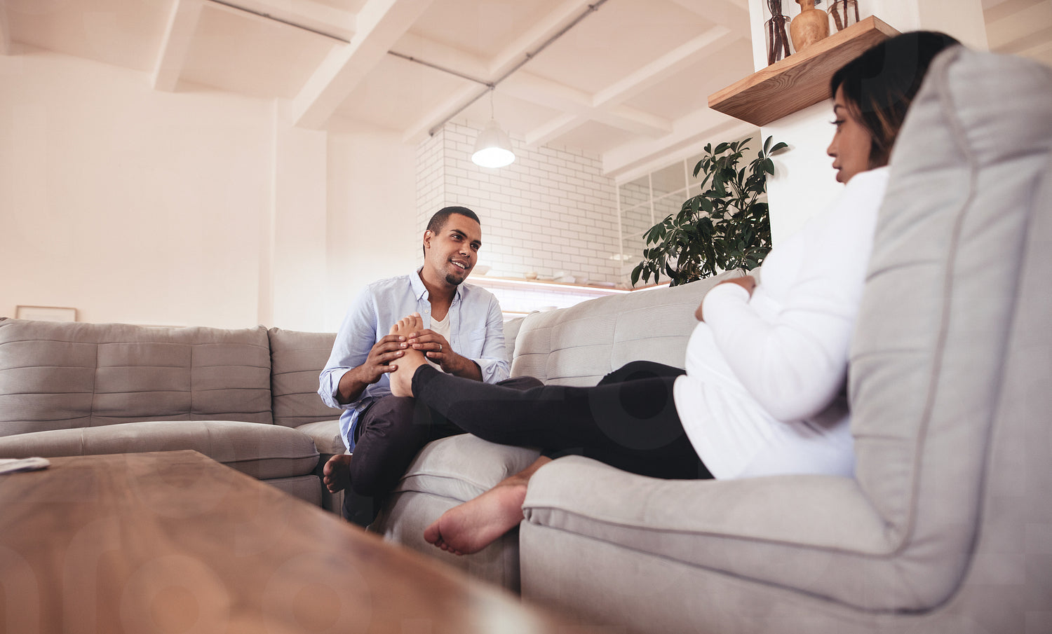 Husband massaging his pregnant wife legs while sitting together on sofa. Man giving feet massage to pregnant woman at home.