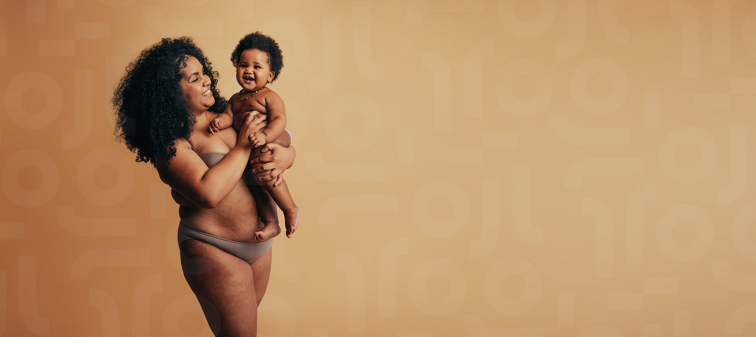 African american woman carrying her child in her arms over brown background. Cheerful mother and baby.