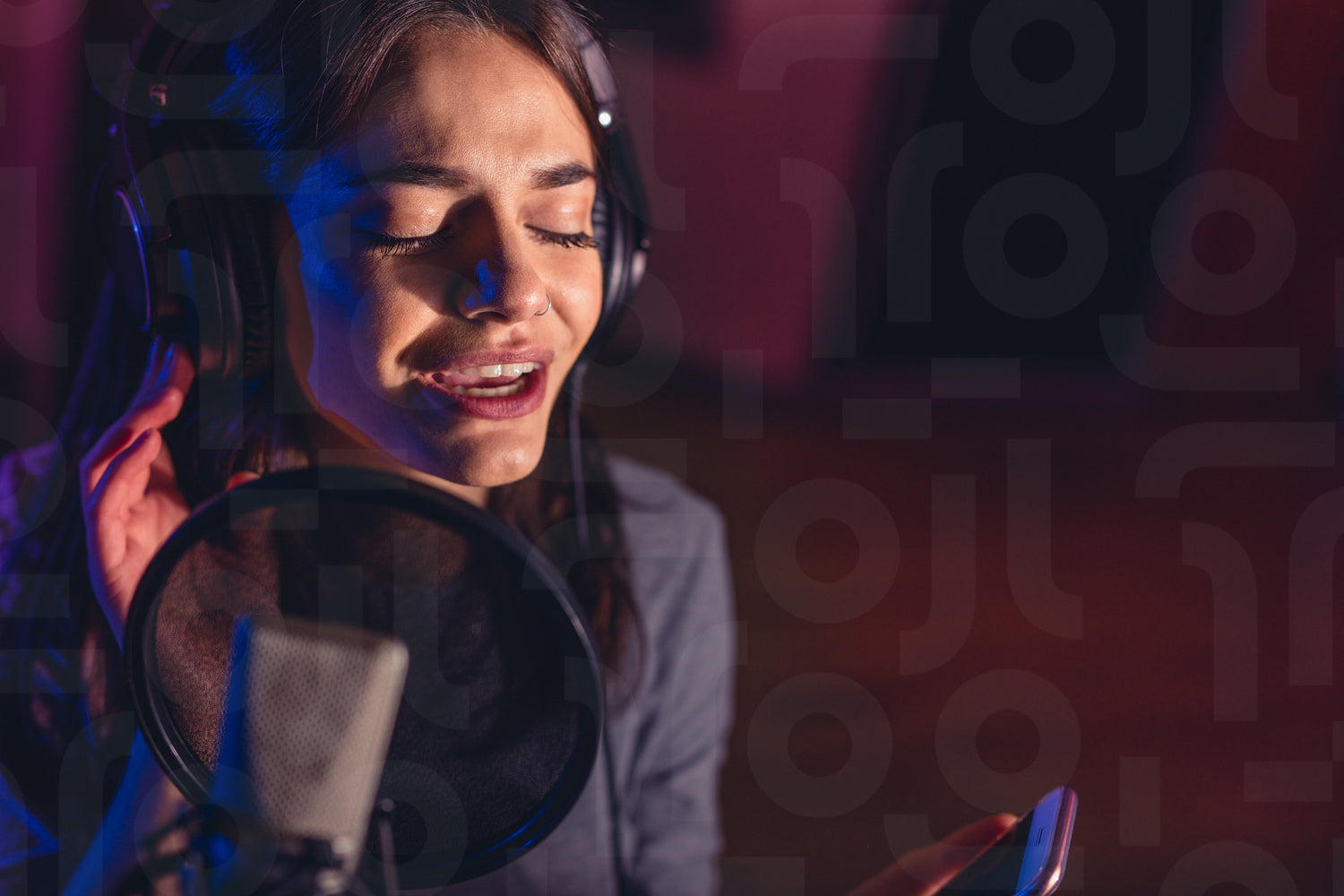Young woman singing a song in the recording studio with mobile phone. Female singer in front of microphone reading lyrics on her smartphone and recording her song