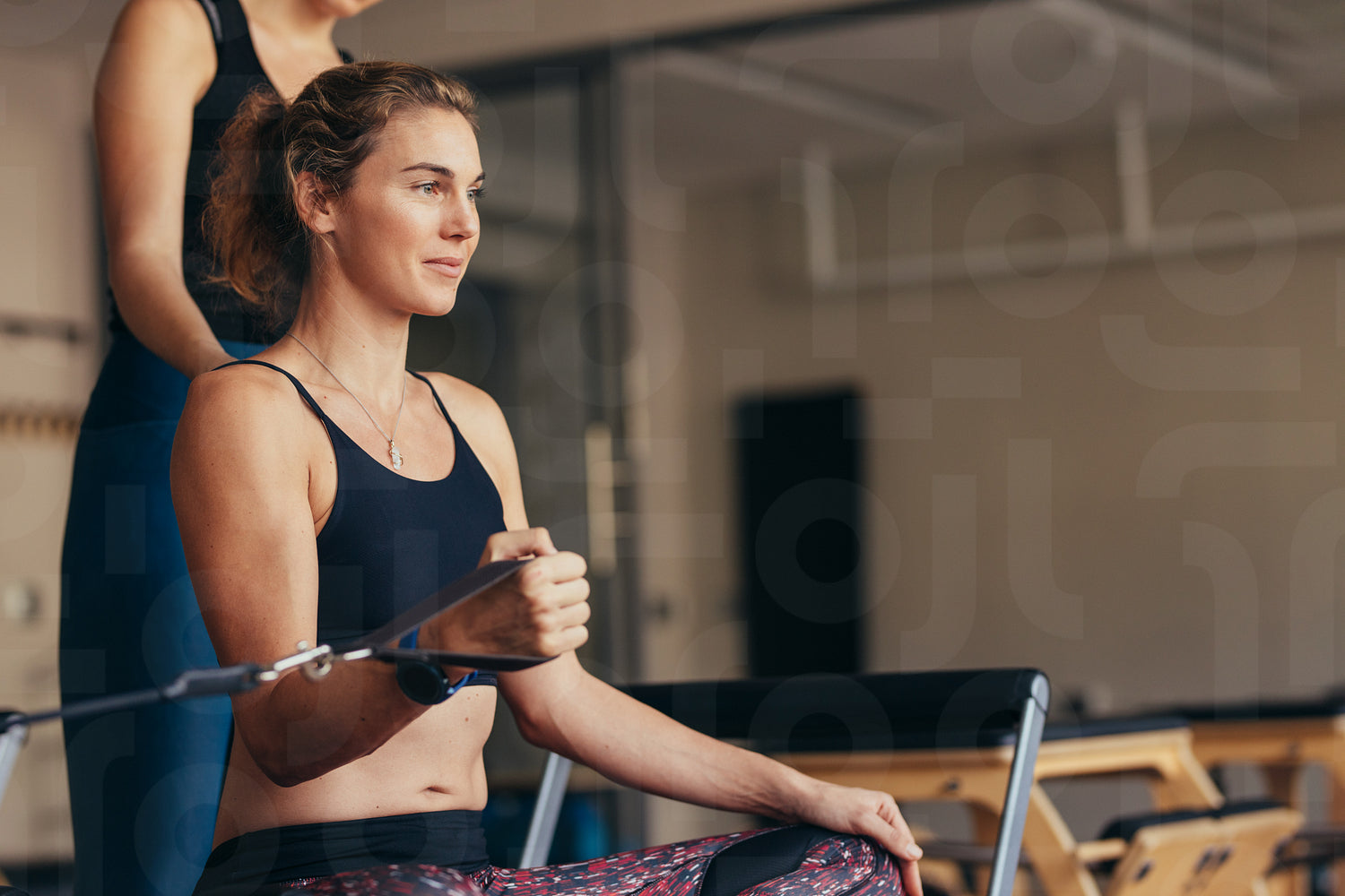 Woman at a pilates gym pulling stretch bands