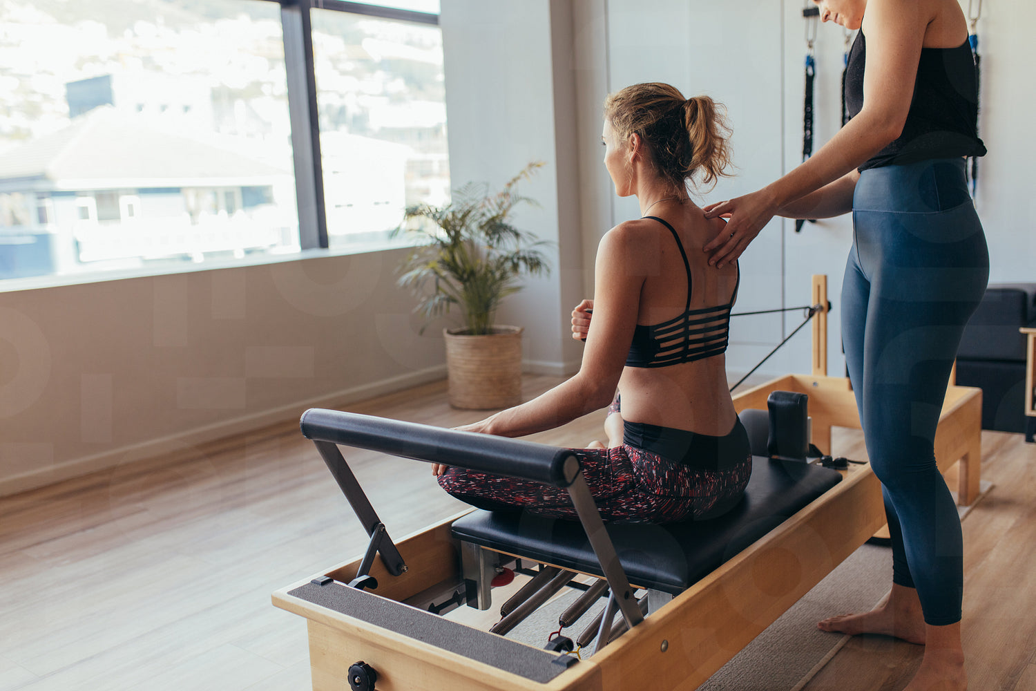 Women sitting on pilates training machine and pulling the stretch band. Pilates trainer helping a woman with her workout at the gym.