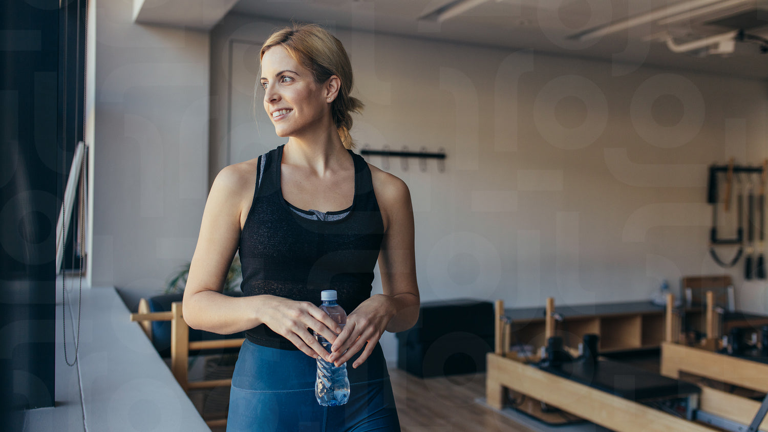 Smiling fitness woman holding a water bottle standing in a pilates gym. Woman relaxing after workout standing in a pilates gym.
