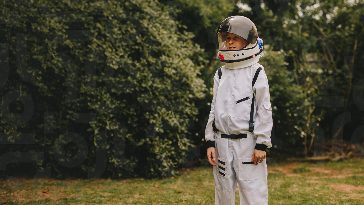 Boy wearing white armor and helmet standing outdoors. Cute boy in space suit and helmet playing astronaut in playground.