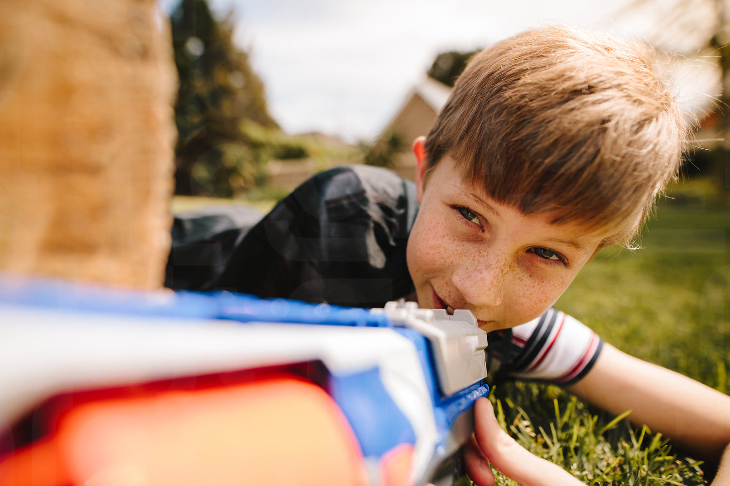 Kid in cape hiding behind a wooden log with toy gun in hands. Cute boy playing with toy gun in playground.