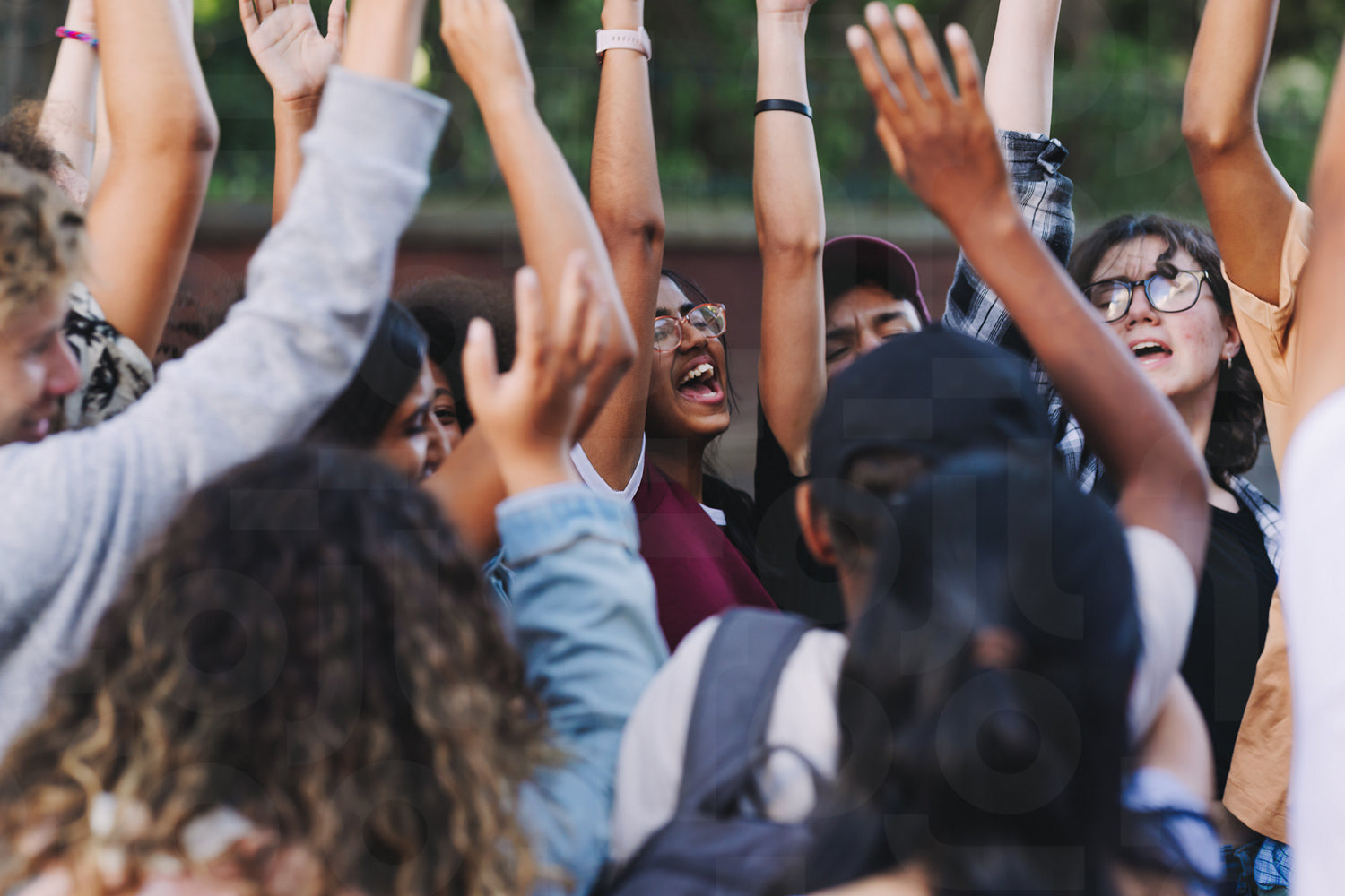Happy young people cheering with their arms raised at a school event. Group of multicultural youth students having fun.