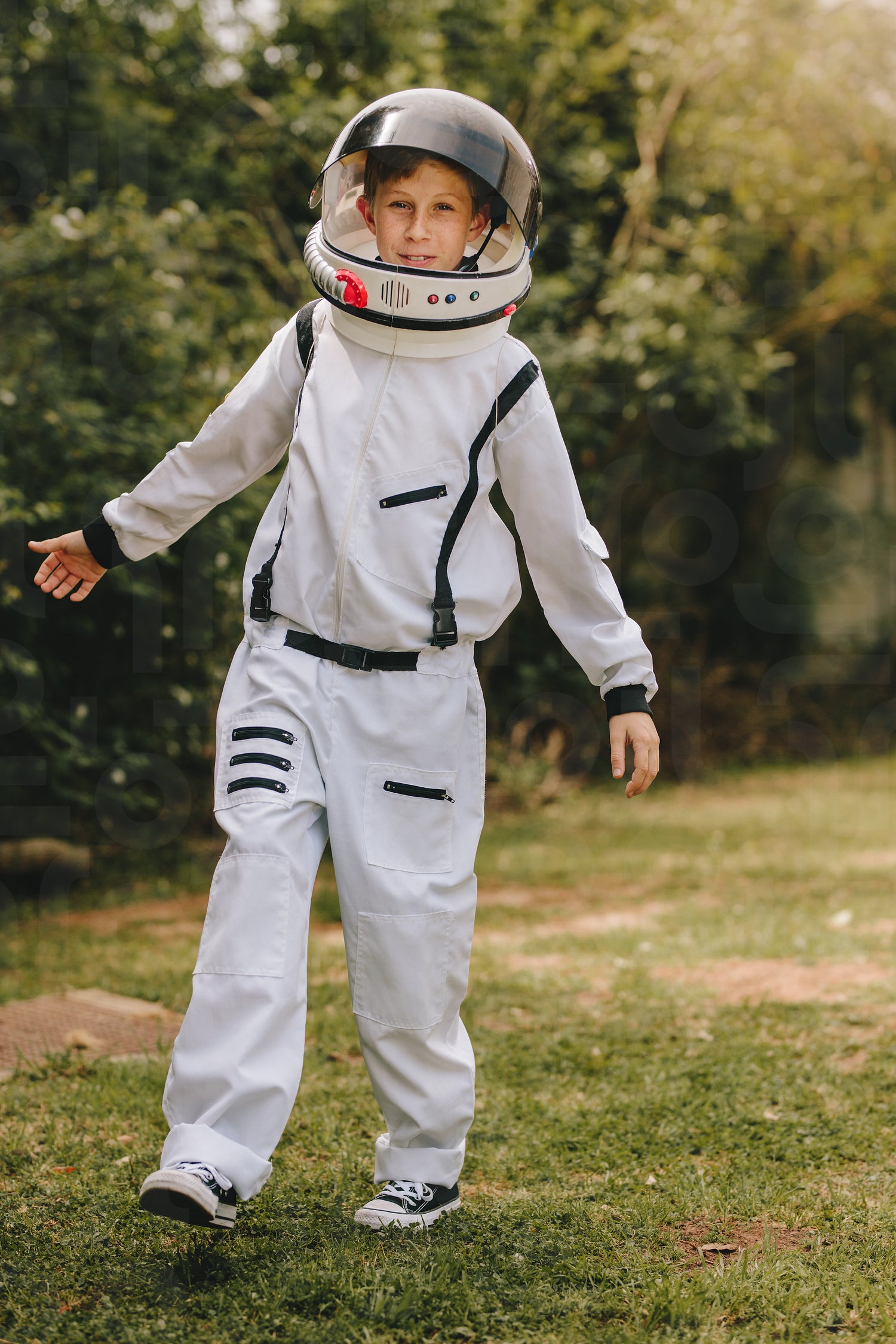 Kid playing in astronaut suit outdoors
