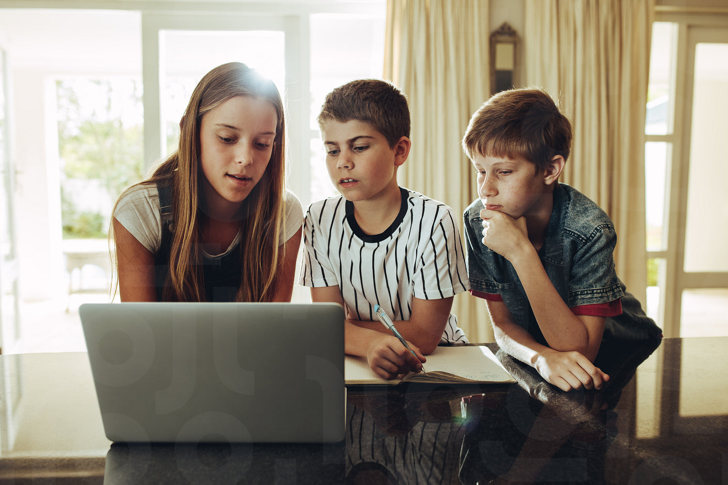 Boys and a girl looking at a laptop at home and learning. Young teenage girl teaching school lessons to boys on a laptop.