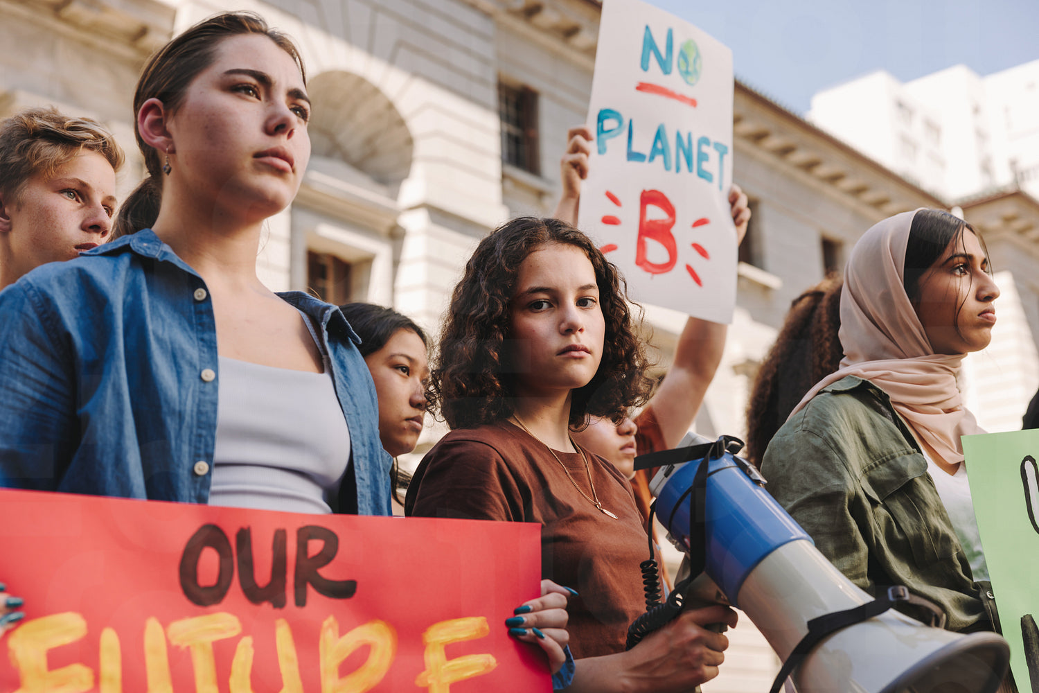 Teenage activist holding a megaphone while marching for climate justice with a group of demonstrators. Multicultural young people protesting against global warming and climate change.
