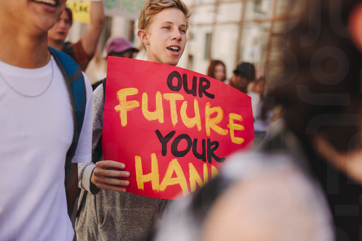 Teenage boy holding a poster while marching against climate change with a group of activists. Multicultural youth protestors campaigning for climate justice and environmental sustainability.