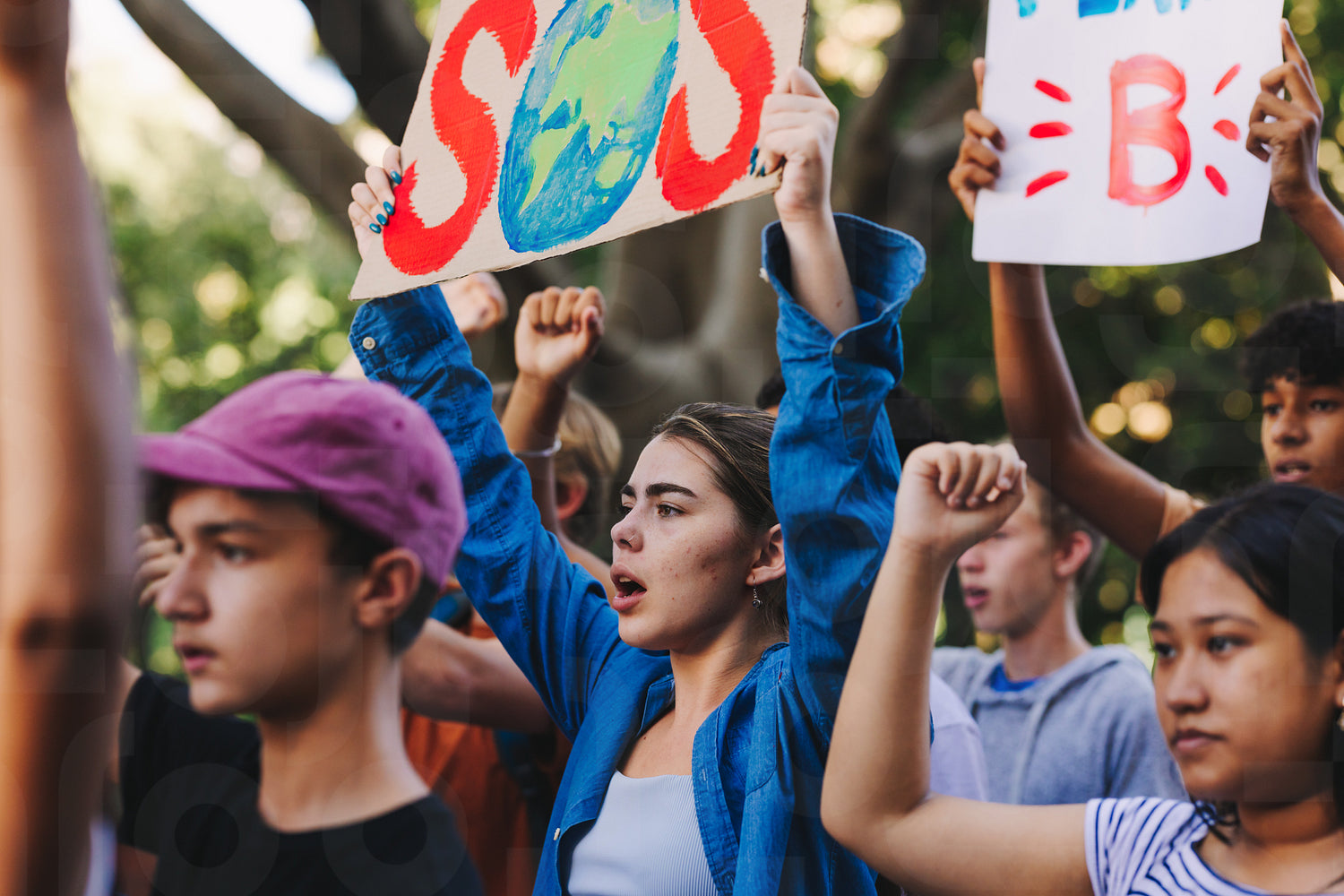 Teenagers campaigning to save planet earth. Group of multicultural youth activists marching against global warming and climate change. Diverse young people joining the global climate strike.