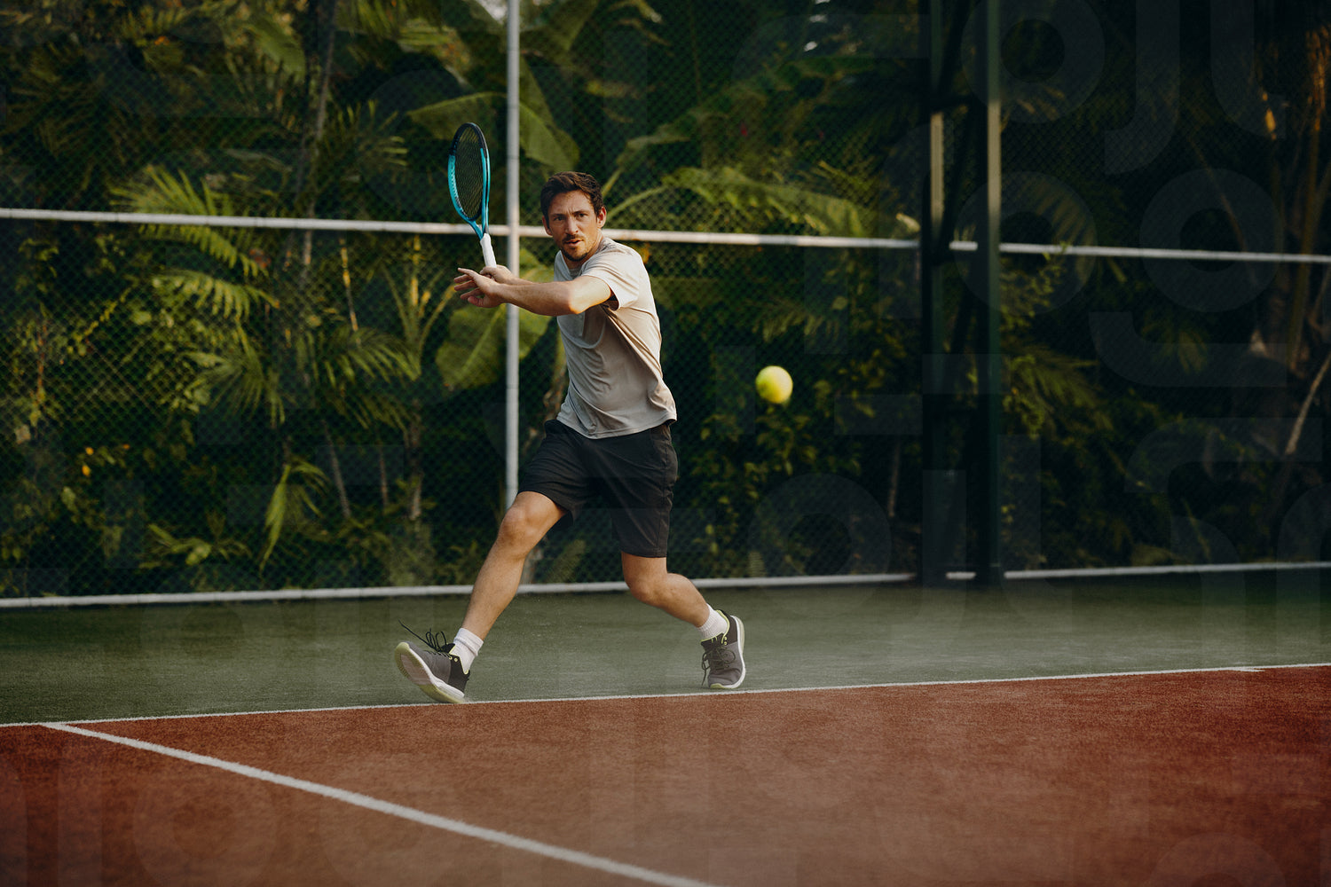 A tennis player in action on an outdoor court surrounded by lush greenery at a holiday resort. The setting sun creates a warm ambiance, reflecting the relaxation and leisure of a vacation atmosphere.