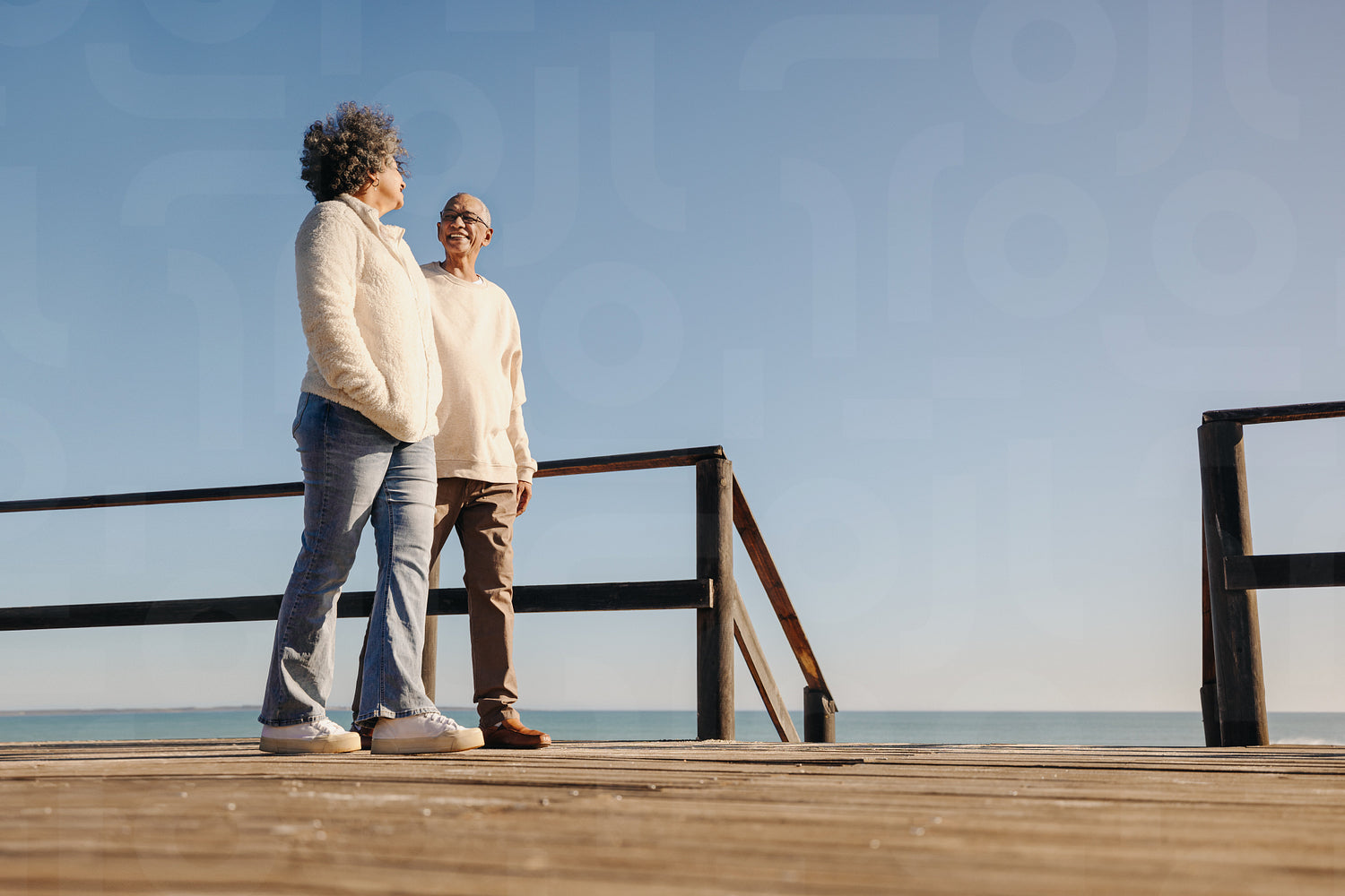 Low angle view of a mature couple smiling at each other while taking a stroll along a boardwalk at the beach. Romantic senior couple enjoying spending quality time together after retirement.