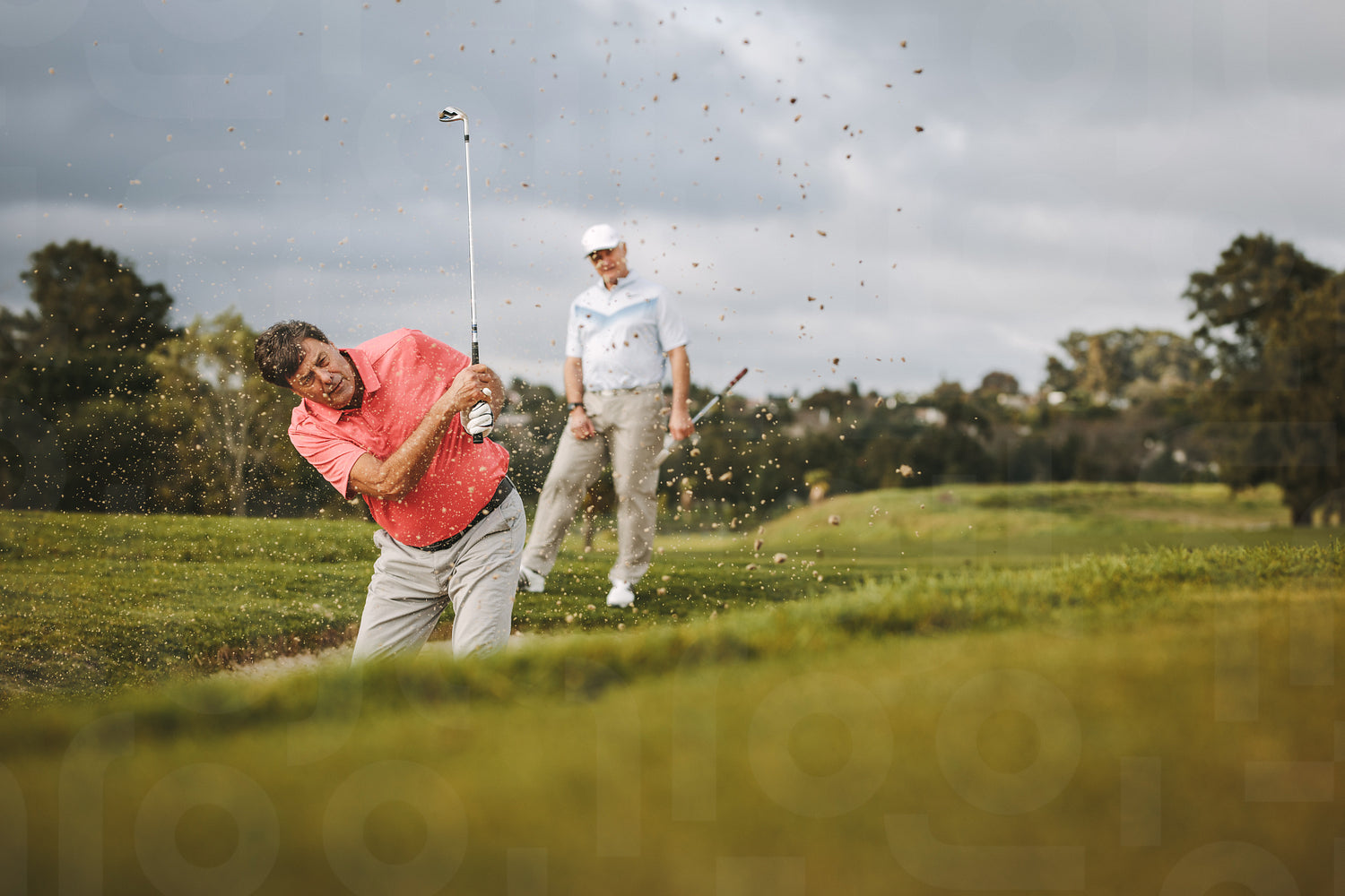 Senior male golfer playing golf on the course. Man hitting the ball out of a sand bunker with his opponent standing at the back.