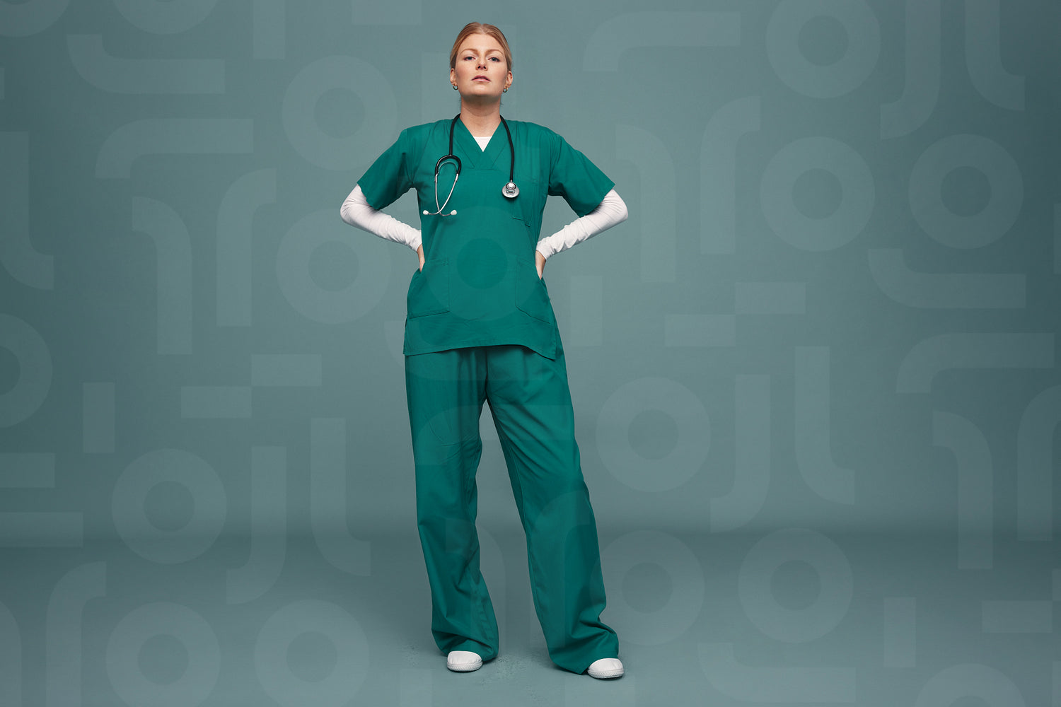Confident female doctor wearing green medical scrubs and a stethoscope around her neck. Young female surgeon looking at the camera while standing against a studio background.