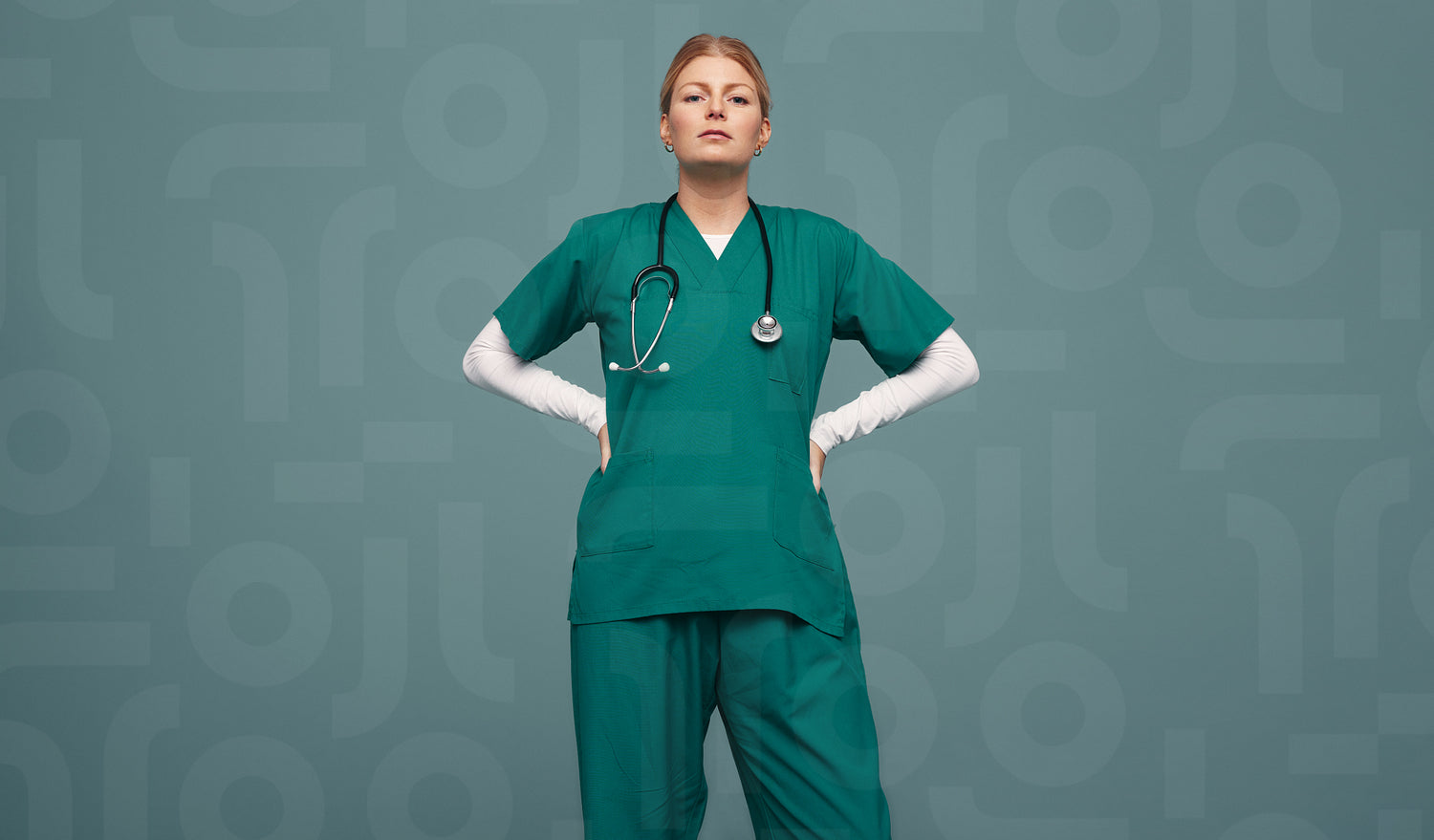 Female doctor wearing green medical scrubs and a stethoscope around her neck. Young female surgeon looking at the camera while standing against a studio background.