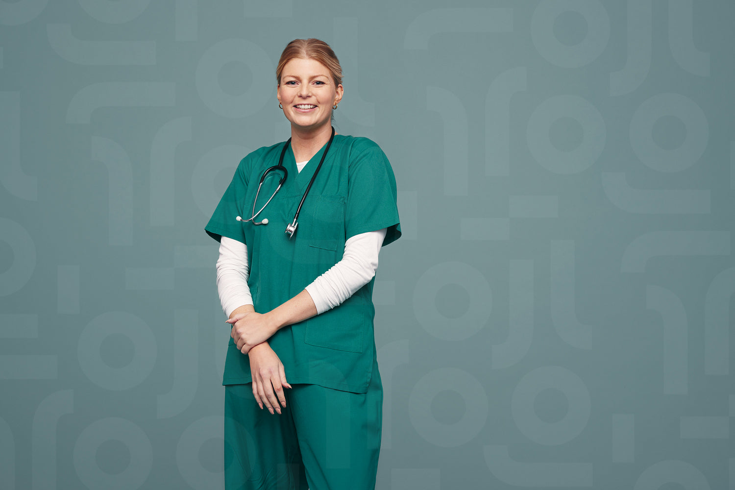 Happy female doctor smiling at the camera while standing against a studio background. Cheerful young surgeon wearing green scrubs and a stethoscope around her neck.
