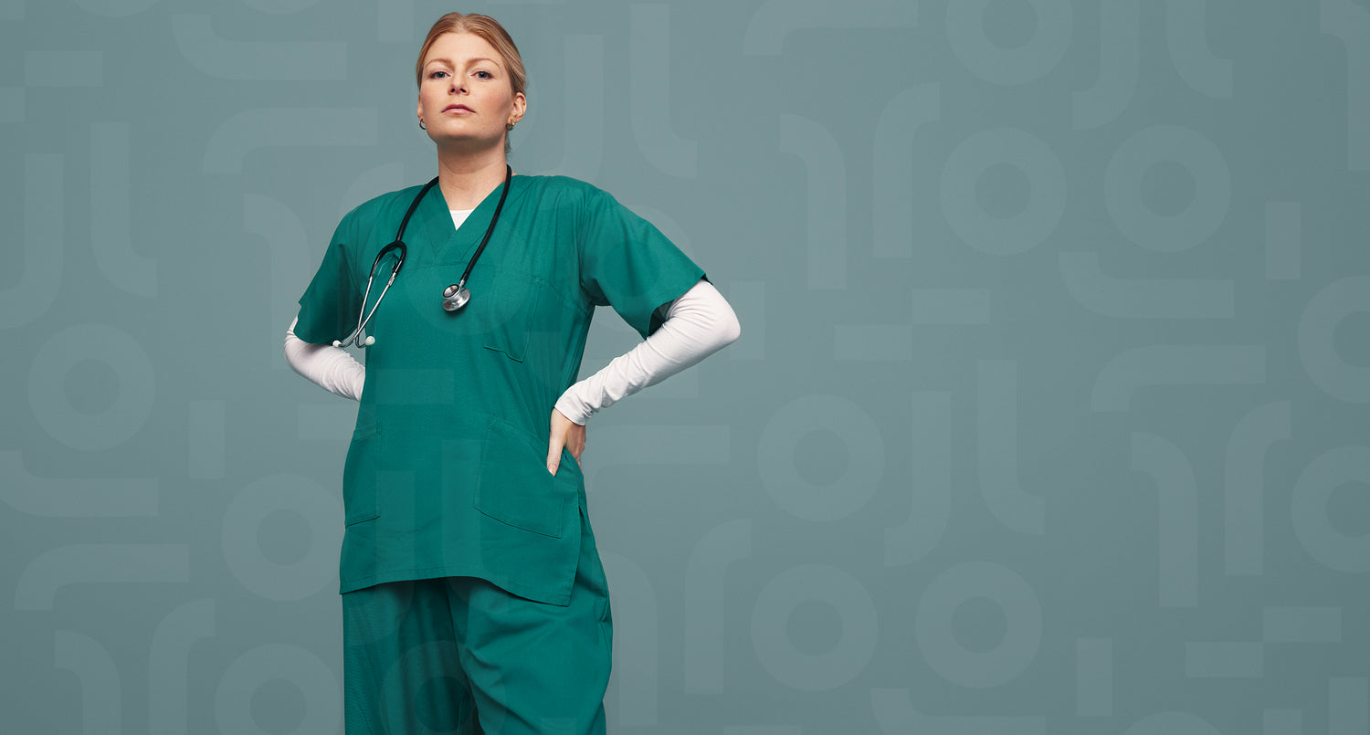 Young female doctor wearing green medical scrubs and a stethoscope around her neck. Young female surgeon looking at the camera while standing against a studio background.
