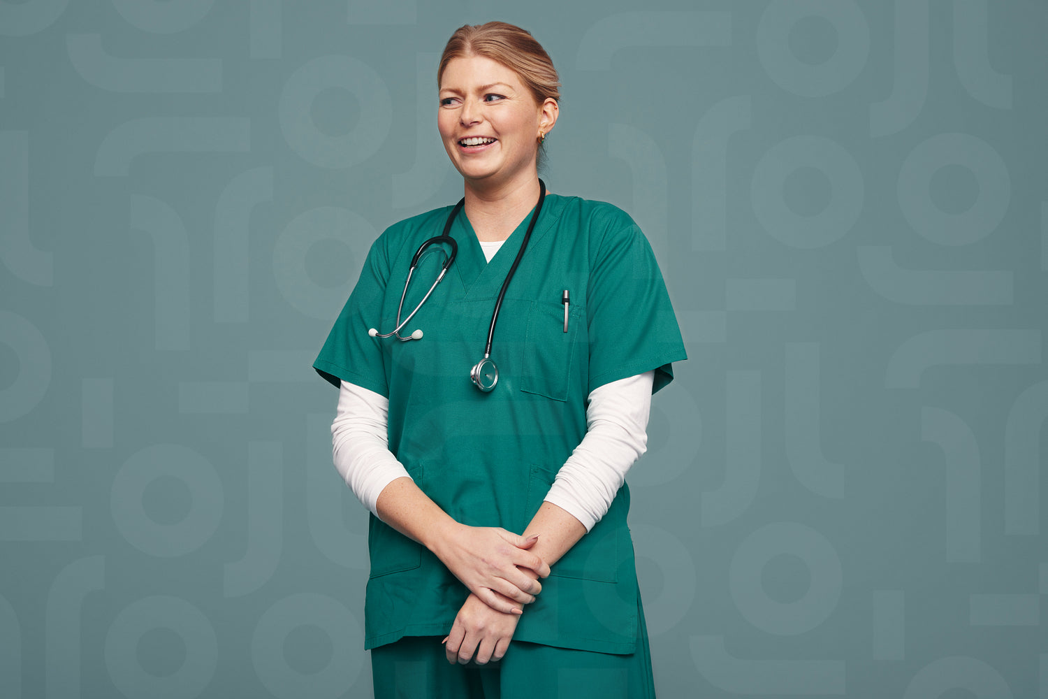 Young medical doctor smiling cheerfully while standing against a studio background. Happy young surgeon wearing green scrubs and a stethoscope around her neck.