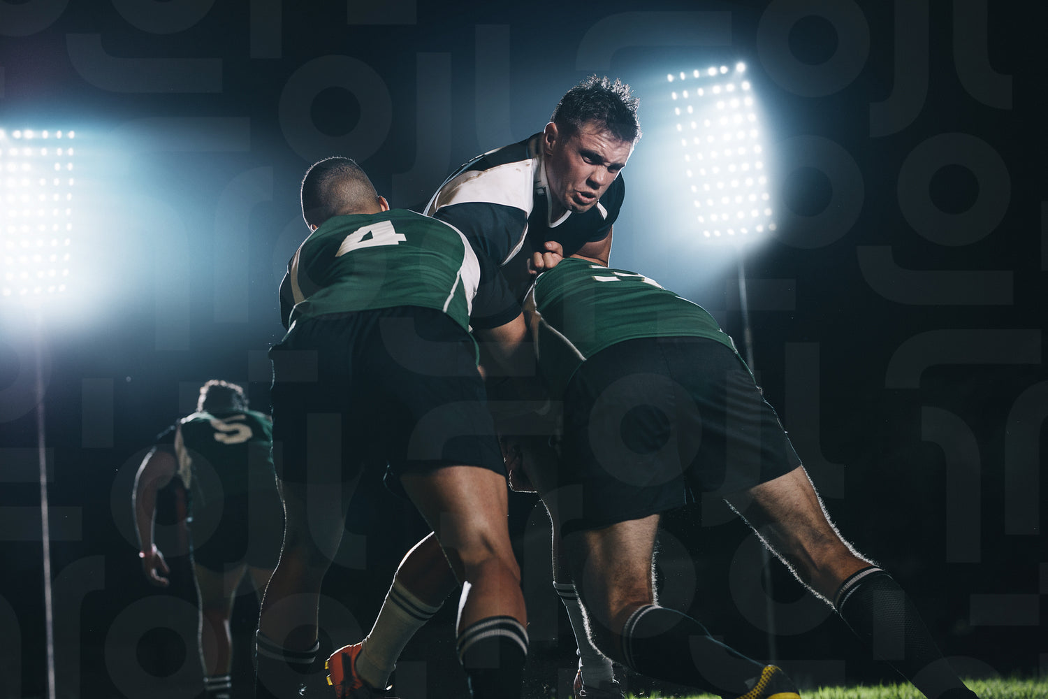 Rugby players fighting for the ball during the night game. Rugby player tackled opponent team players in match.