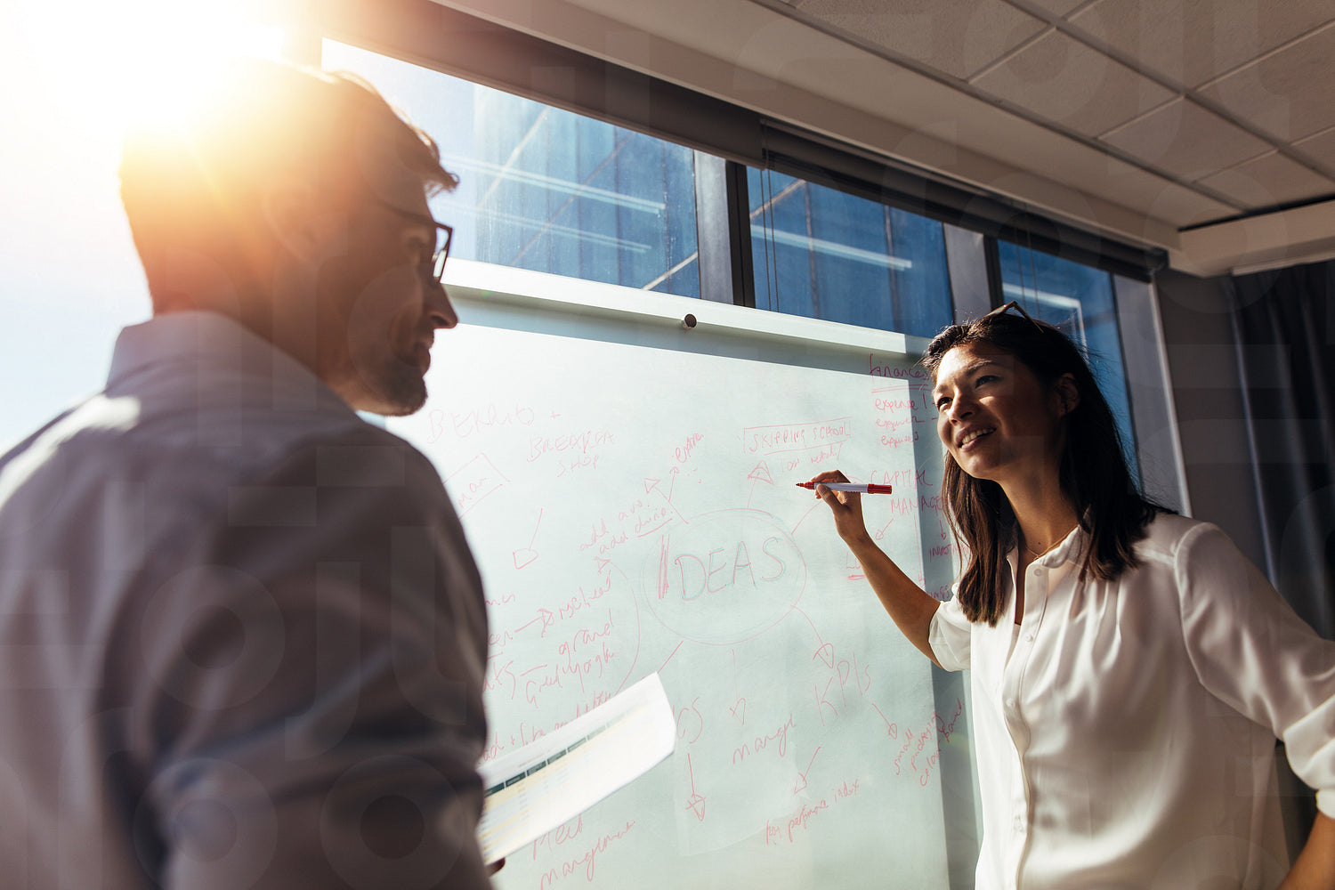 Businesswoman writing ideas on whiteboard during discussion in boardroom. Two colleagues discussing business ideas in office.