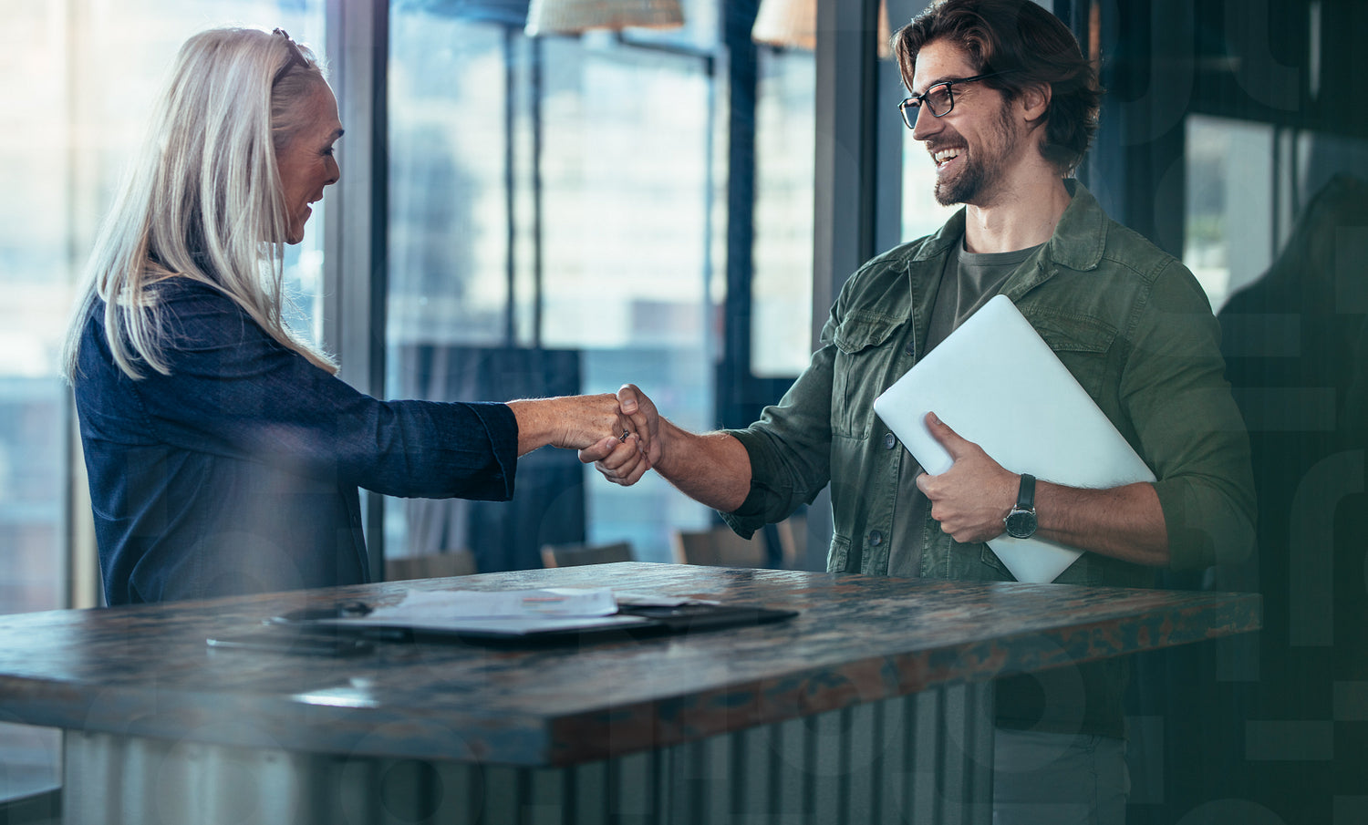 Two business colleagues shaking hands after a successful meeting in office. Business man and woman hand shake after meeting.