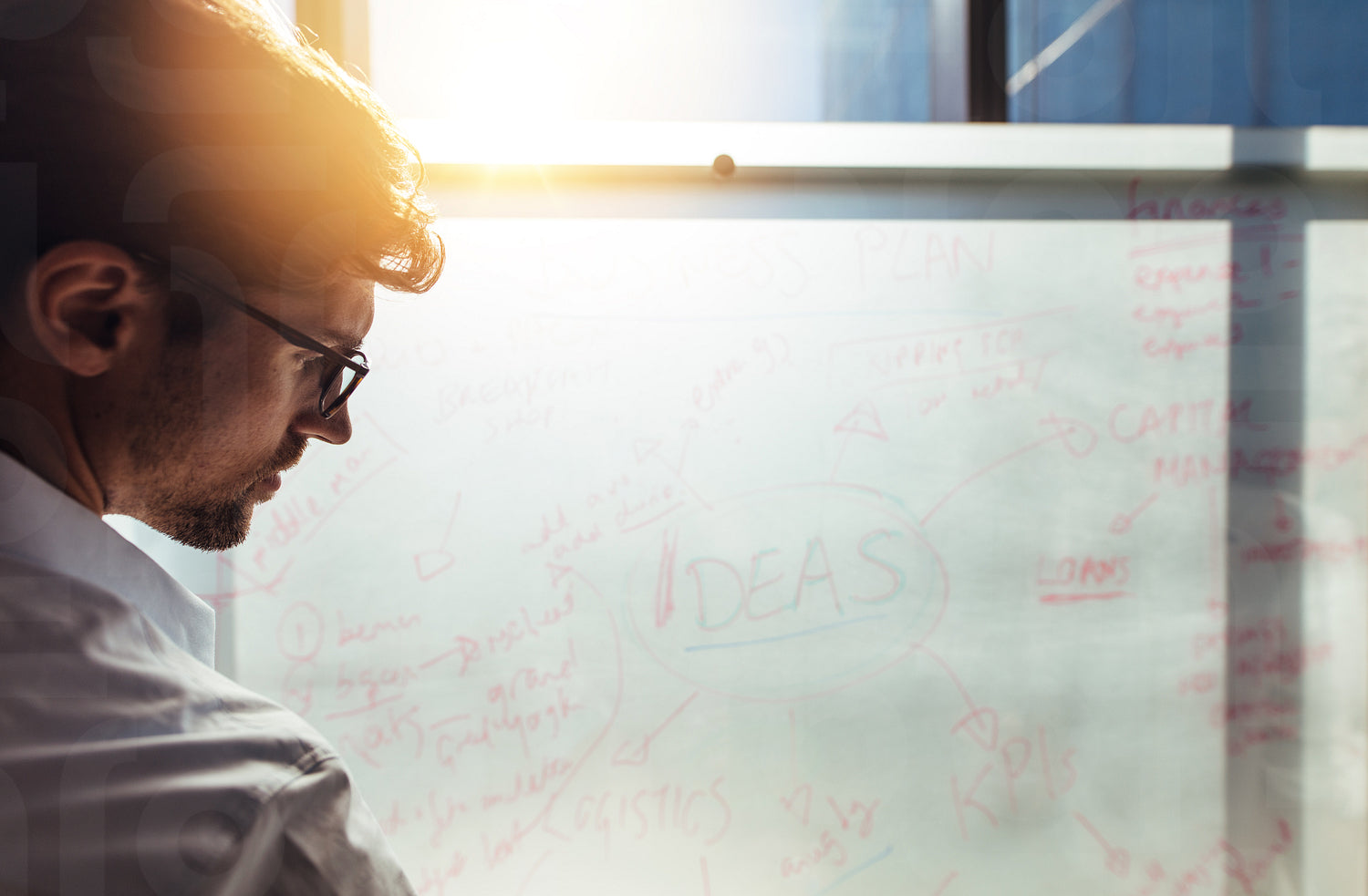 Businessman writing his ideas on whiteboard in office. Close-up of businessman wearing glasses presenting a business plan.