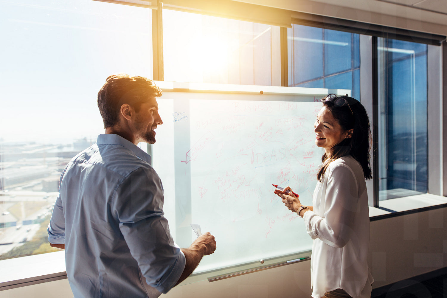 Businesswoman writing ideas on whiteboard during discussion in boardroom. Two colleagues discussing business ideas in office.
