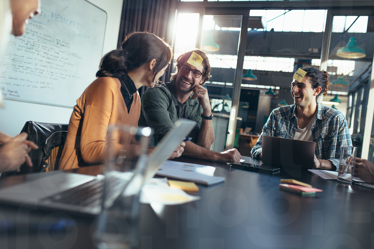 Business team sitting around a table in office lobby with sticky notes on their forehead having a brainstorming meeting. Corporate business people sitting in board room and discussing.