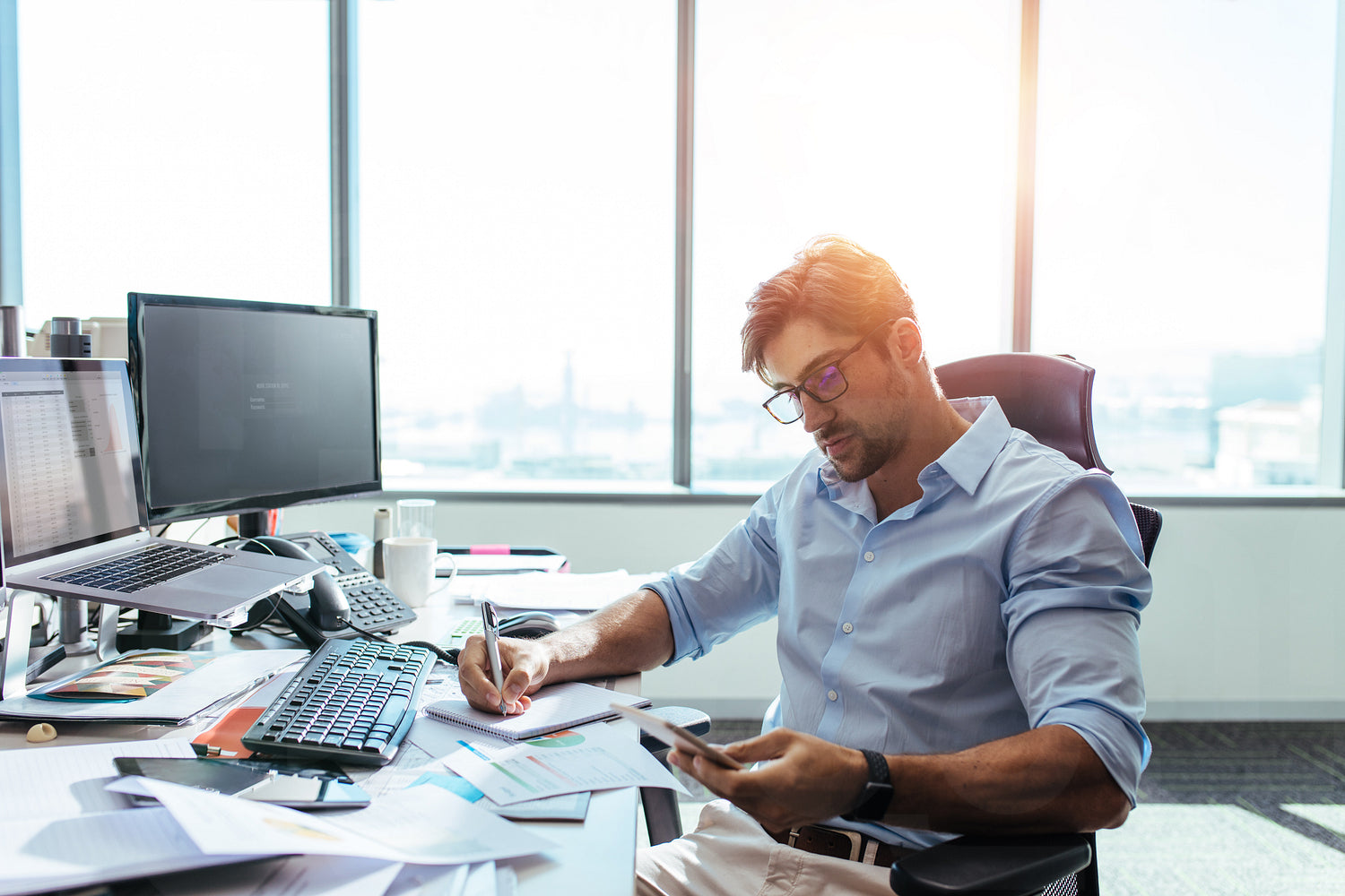 Entrepreneur making notes while looking at mobile phone. Young businessman sitting at his desk in office working with papers while seated in front of desktop computers.