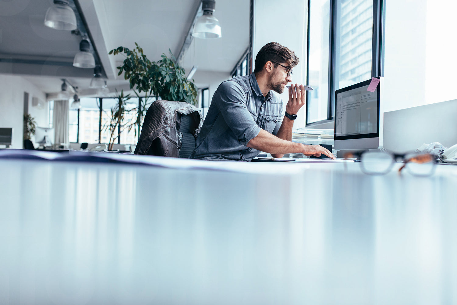 Male executive working on computer and talking on mobile phone. Businessman working in office with phone.