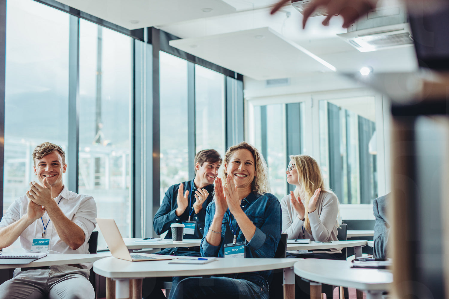 Businesspeople clapping hands in seminar. Audience applauding after successful conference.