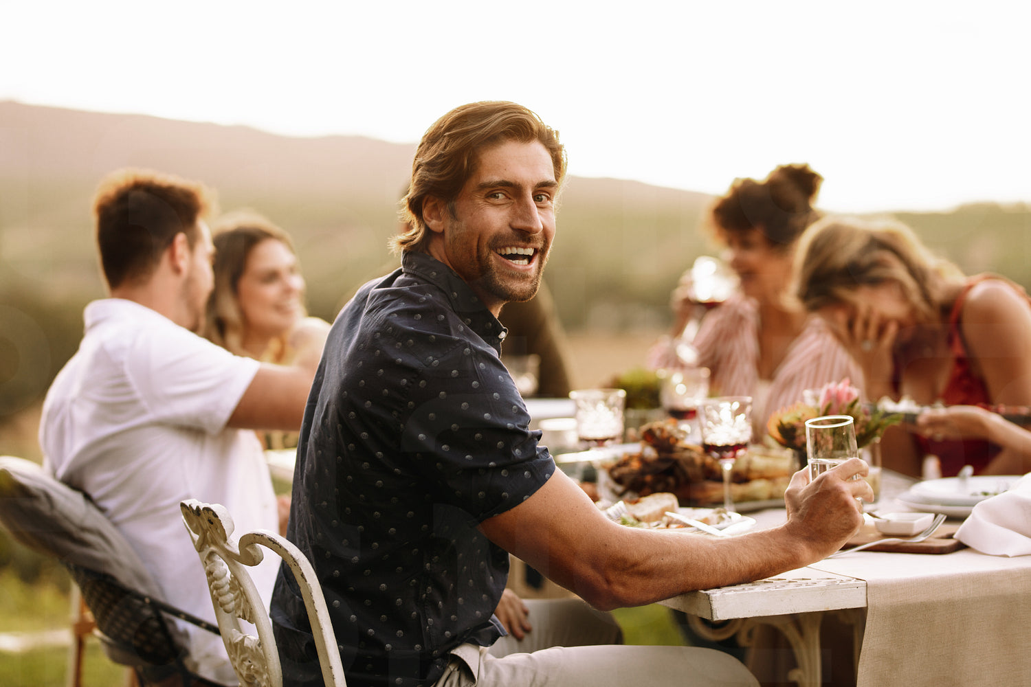Handsome man having drinks with friends sitting by at dinner party. Young guy enjoying at outdoor party with friends.
