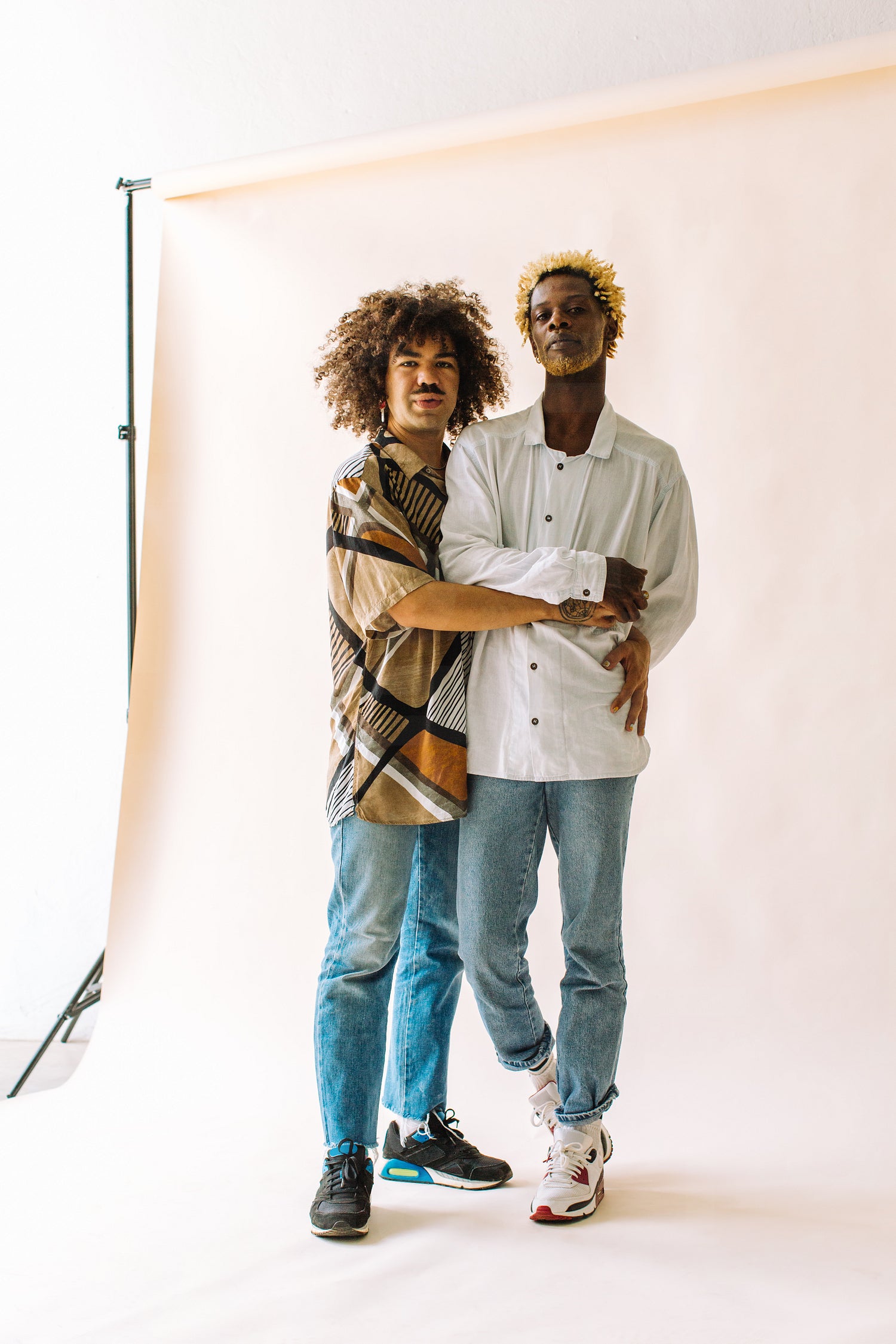 Affectionate male lovers embracing each other while standing together in a studio. Two young male lovers posing together against a studio background. Young gay couple looking at the camera.