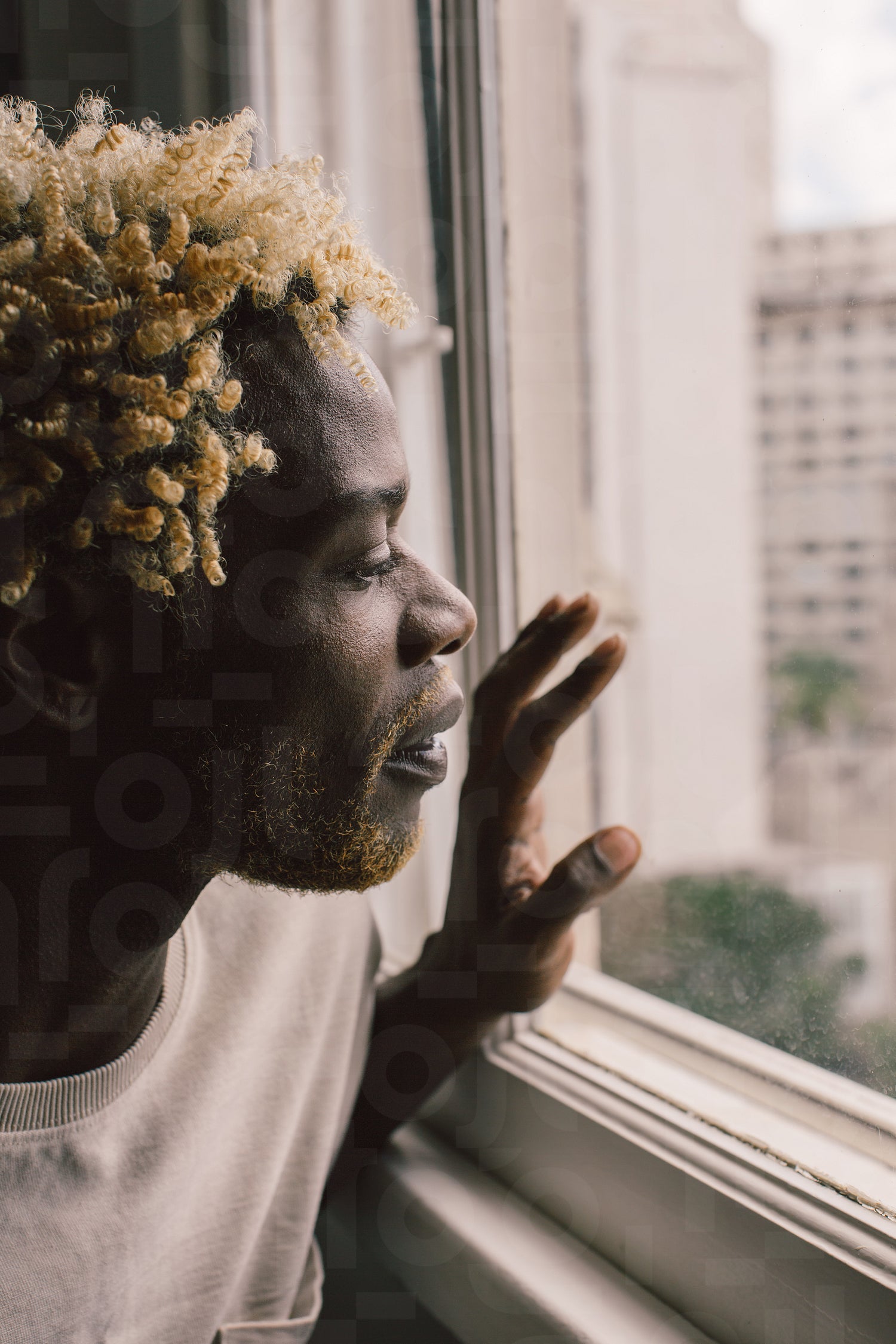 Black gay man looking outside his window during the day. Young queer man standing alone by a window indoors. Young gay man looking thoughtful at home.