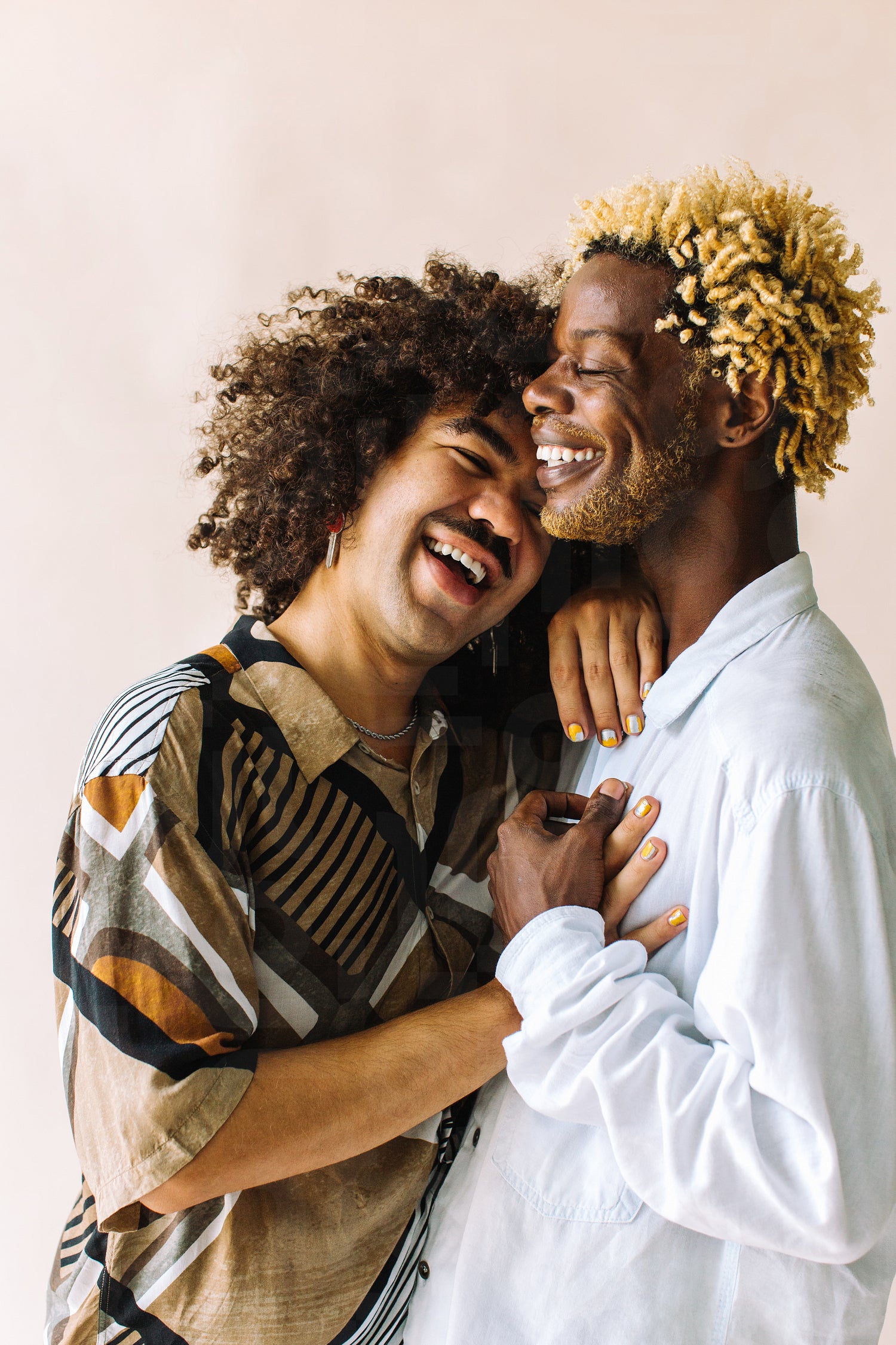 Carefree young gay couple standing together in a studio. Two affectionate male lovers smiling cheerfully while embracing each other against a studio background. Young gay coupe being romantic.