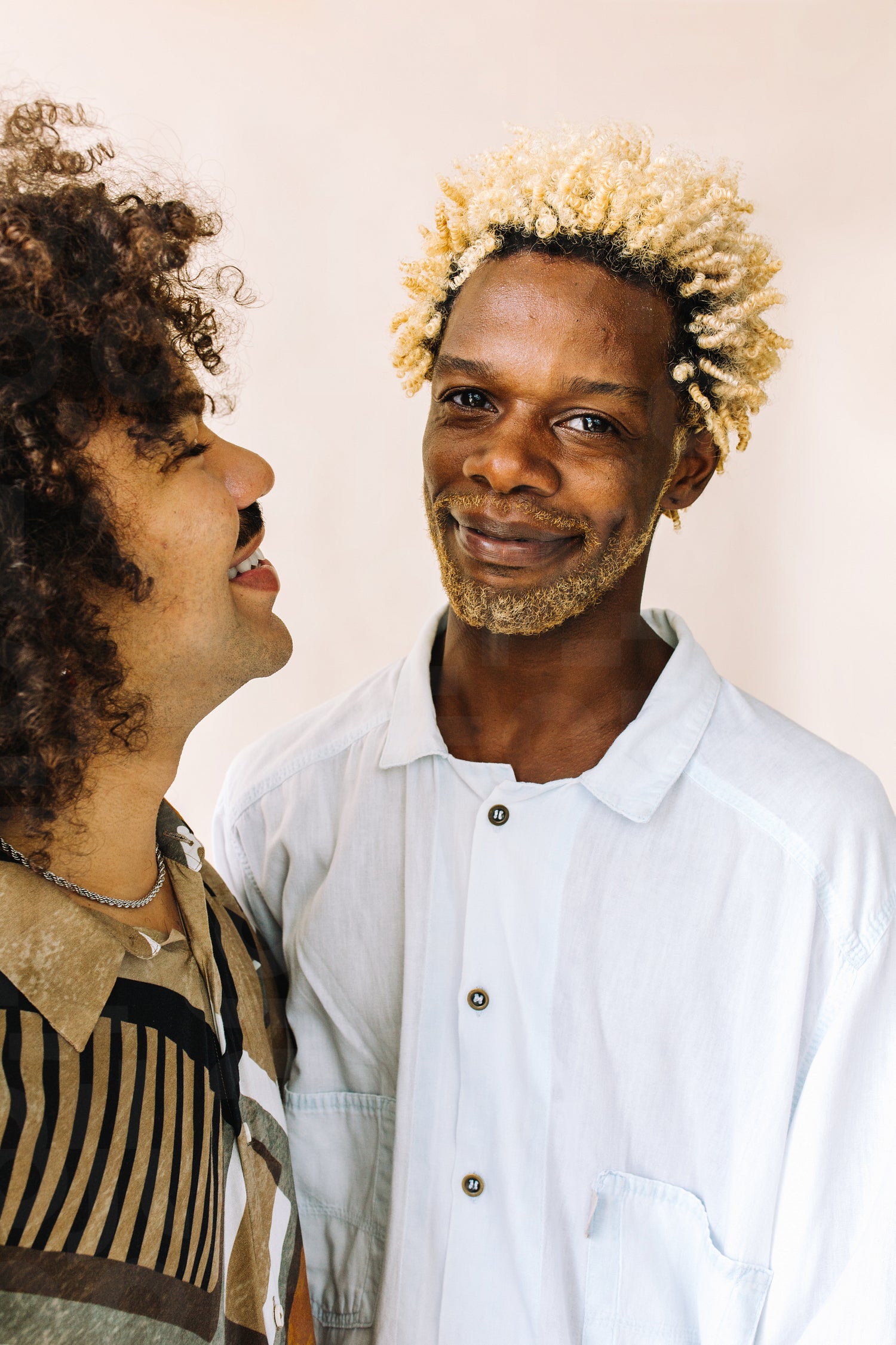 Ethnic gay man standing with his lover. Young gay man looking at the camera with a slight smile on his face in a studio. Romantic young gay couple posing together against a studio background.