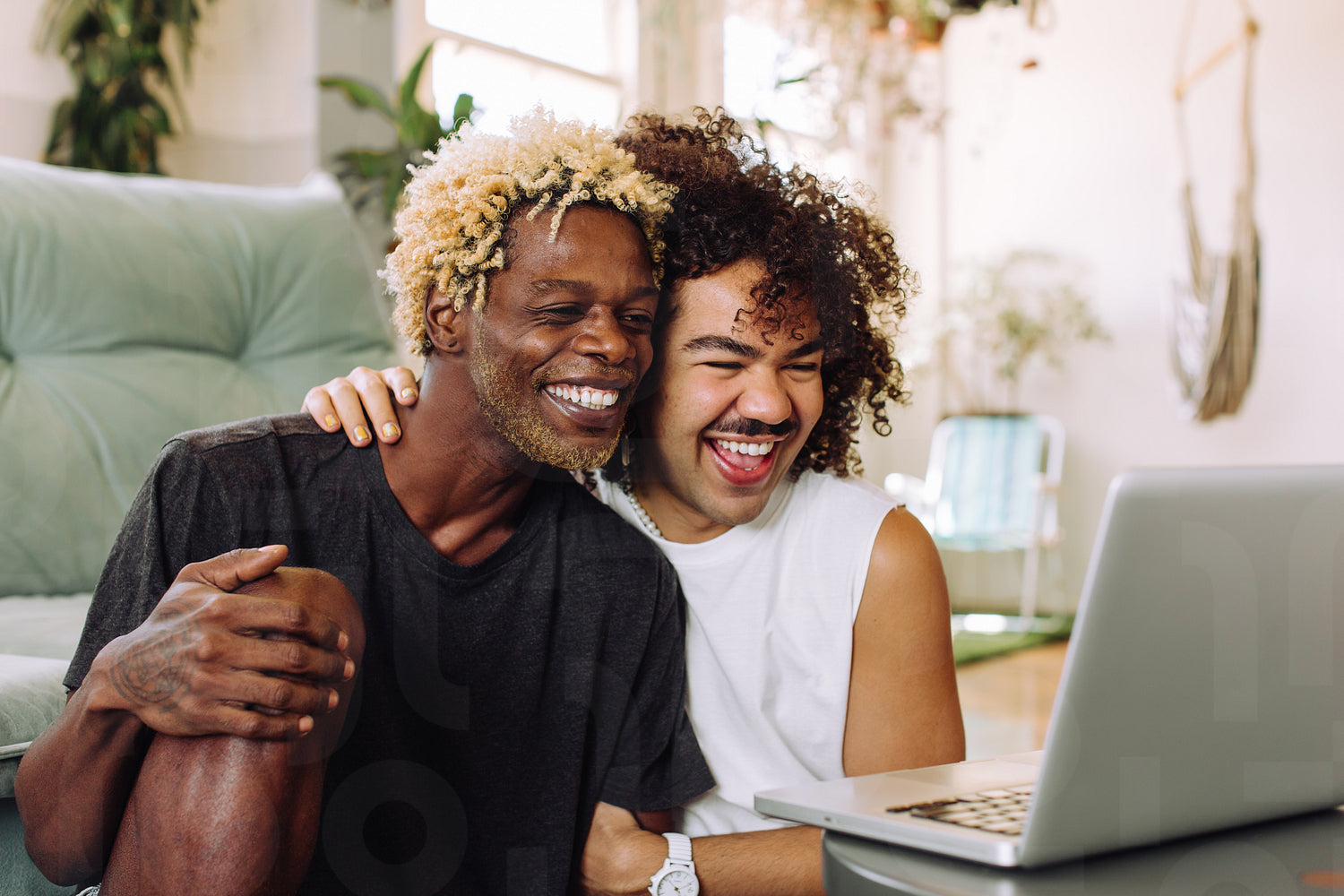 Young male lovers video calling their friends in their living room at home. Young gay couple smiling cheerfully while taking a video call on a laptop. Young gay couple sitting together indoors.