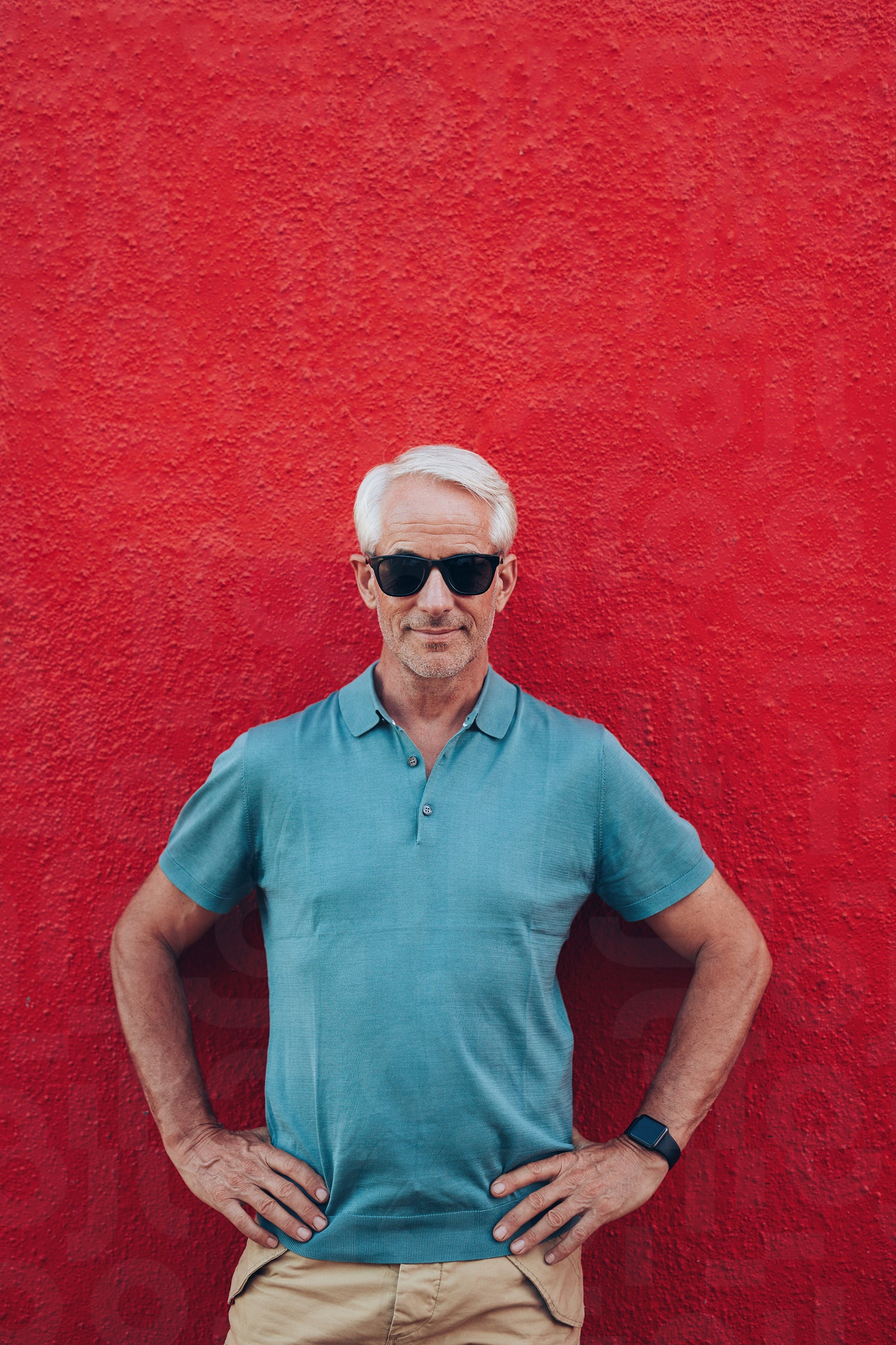 Portrait of handsome mature man standing his hands on hips against red wall. Smart middle aged man with glasses on red background.
