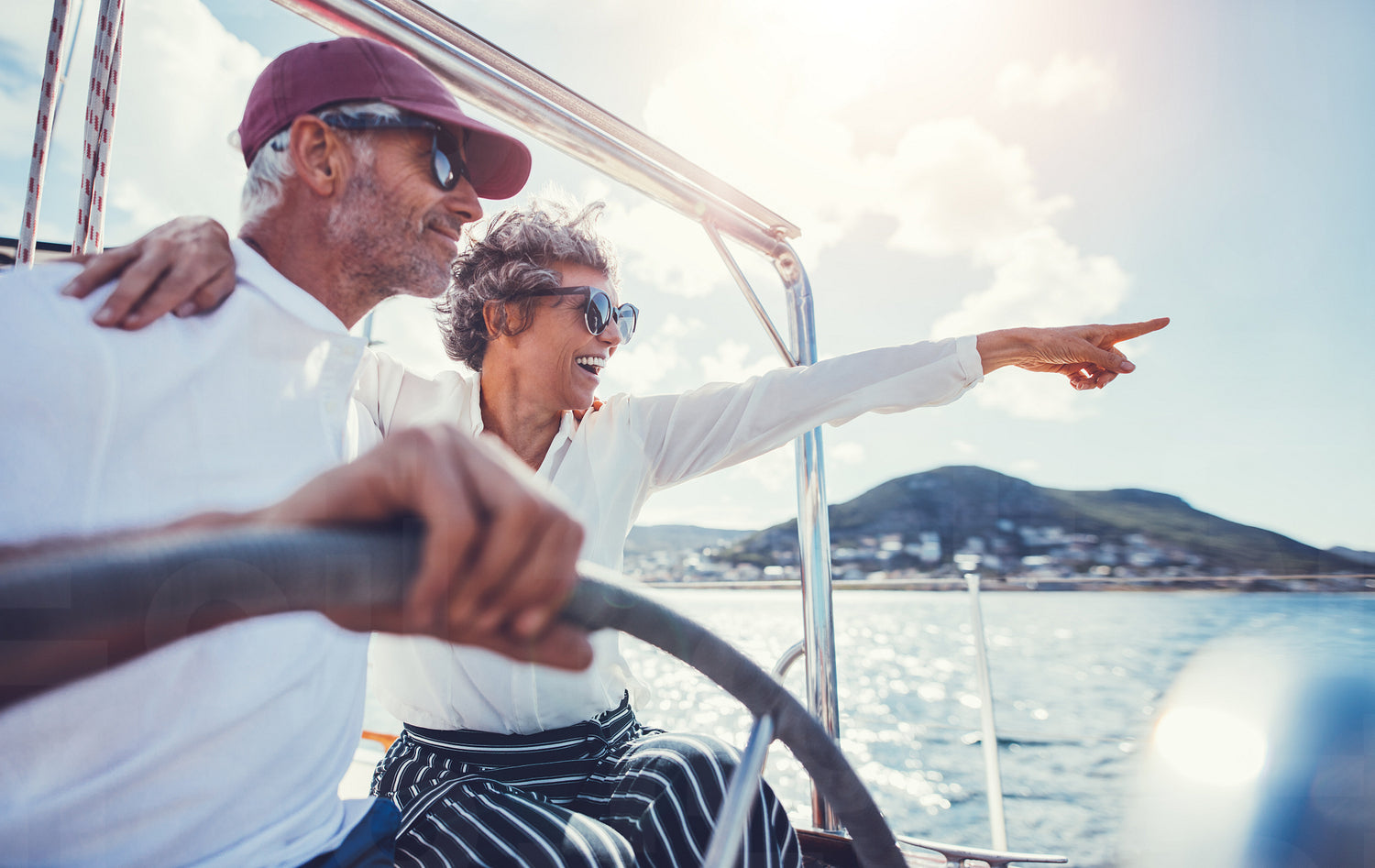 Mature couple standing at the wheel of a yacht with woman pointing at a view. Happy senior couple having fun on a boat and enjoying on summer holiday.