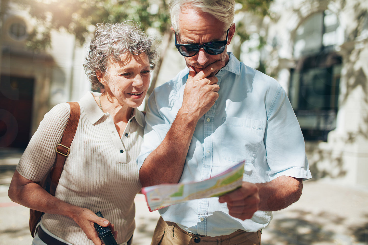 Senior couple looking at a map while sightseeing. Couple of mature tourist using city map on their vacation.